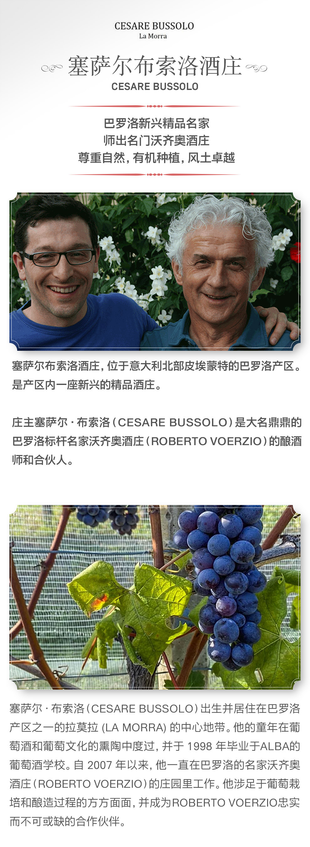 庄主塞萨尔·布索洛(Cesare Bussolo)是大名鼎鼎的巴罗洛标杆名家沃齐奥酒庄(Roberto Voerzio)的酿酒师和合伙人。