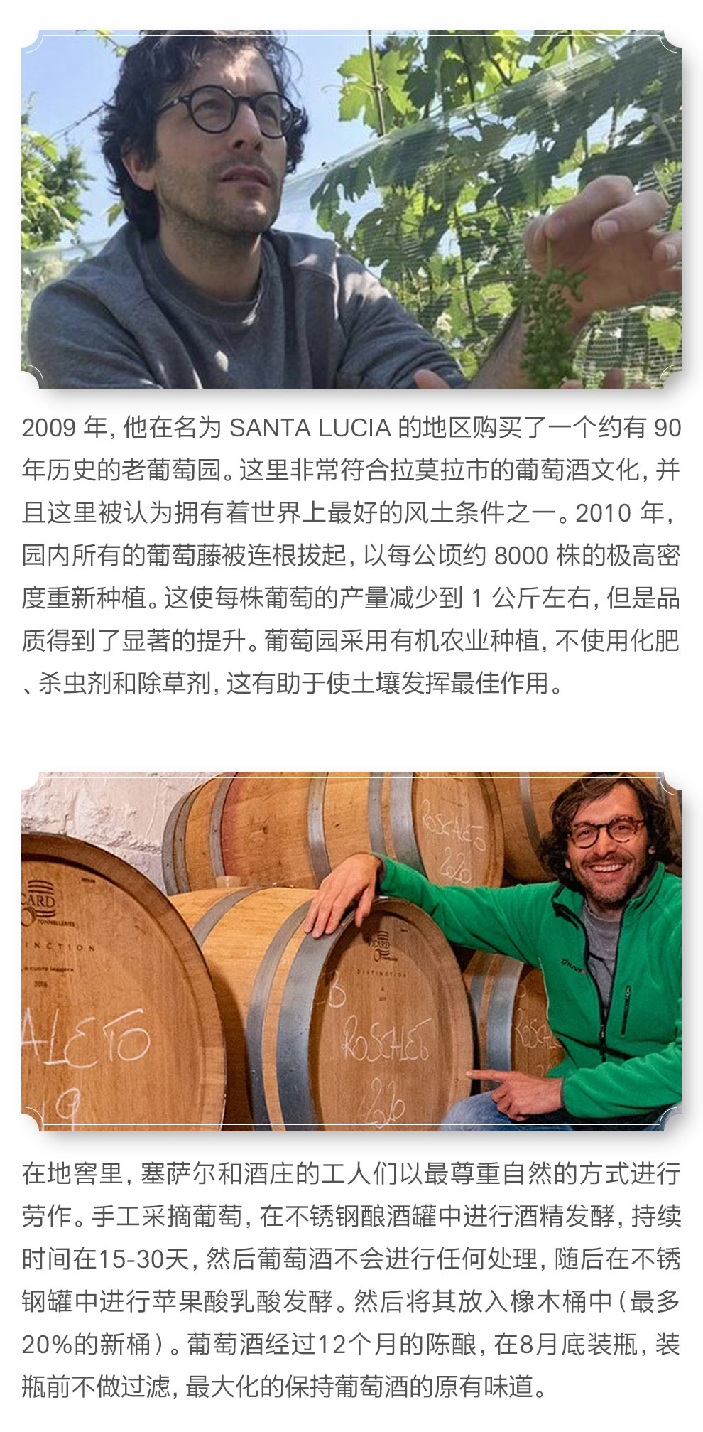 2009 年,他在名为 Santa Lucia 的地区购买了一个约有 90 年历史的老葡萄园,非常适合拉莫拉市的巴贝拉葡萄园文化,因为这里被认为拥有着世界上最好的风土条件之一。2010 年,园内所有的葡萄藤被连根拔起,以每公顷约 8000 株的极高密度重新种植。这使每株葡萄的产量减少到 1 公斤左右,但是品质得到了显著的提升。葡萄园采用有机农业种植,不使用化肥、杀虫剂和除草剂,这有助于使土壤发挥最佳作用。在地窖里,他和酒庄的工人以最自然的方式进行劳作。手工采摘完美成熟的葡萄,由不锈钢罐中唯一的本土酵母进行发酵。葡萄可以发酵 15-30 天。然后葡萄酒不会进行任何处理,随后在不锈钢罐中进行苹果酸乳酸发酵。然后将其放入橡木桶中(最多 20%,最多九个)。葡萄酒经过12个月的陈酿,在8月底装瓶,没有粘连或过滤。