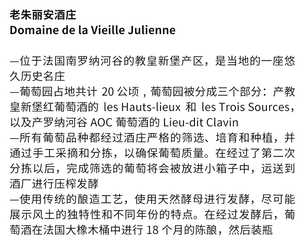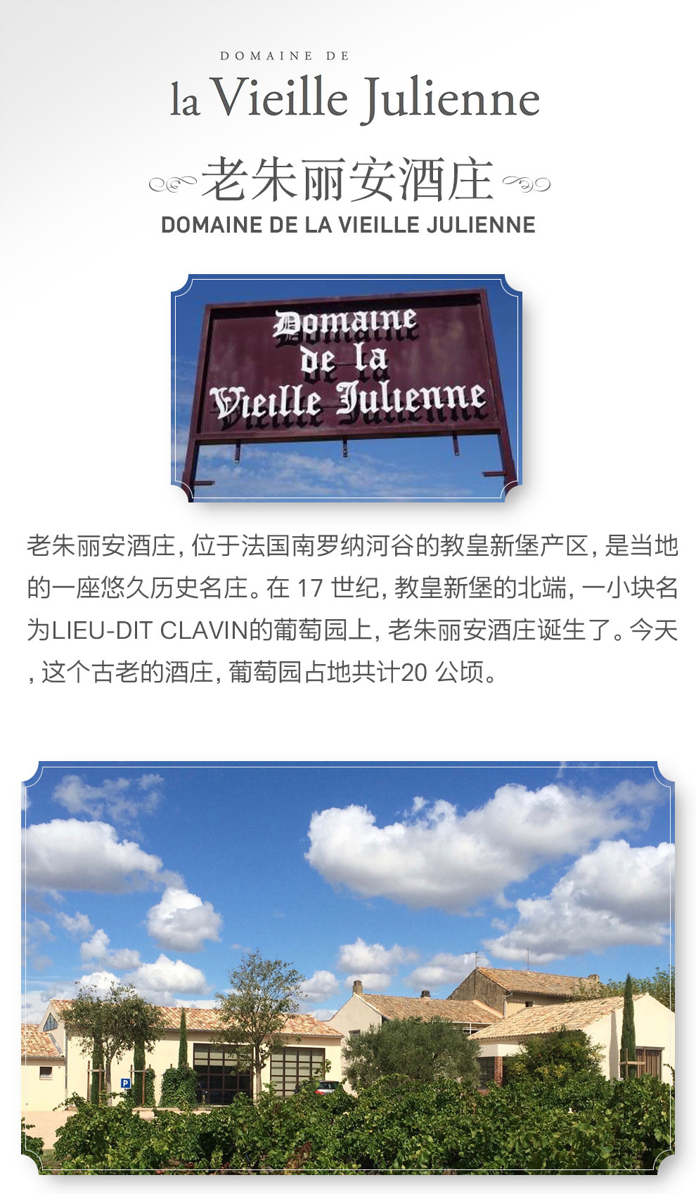 老朱丽安酒庄,位于法国南罗纳河谷的教皇新堡产区,是当地的一座悠久历史名庄。在 17 世纪,教皇新堡的北端,一小块名为lieu-dit Clavin的葡萄园上,老朱丽安酒庄诞生了。今天,这个古老的酒庄,葡萄园占地共计20 公顷。