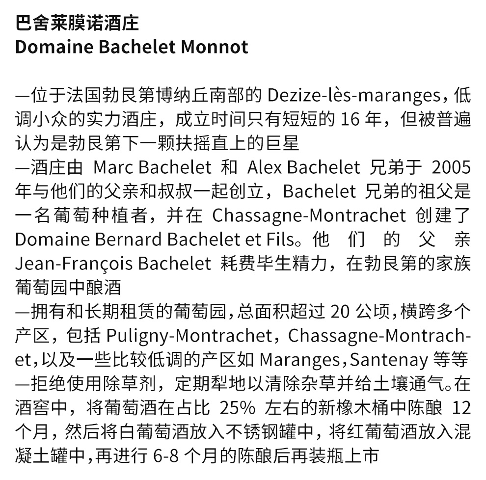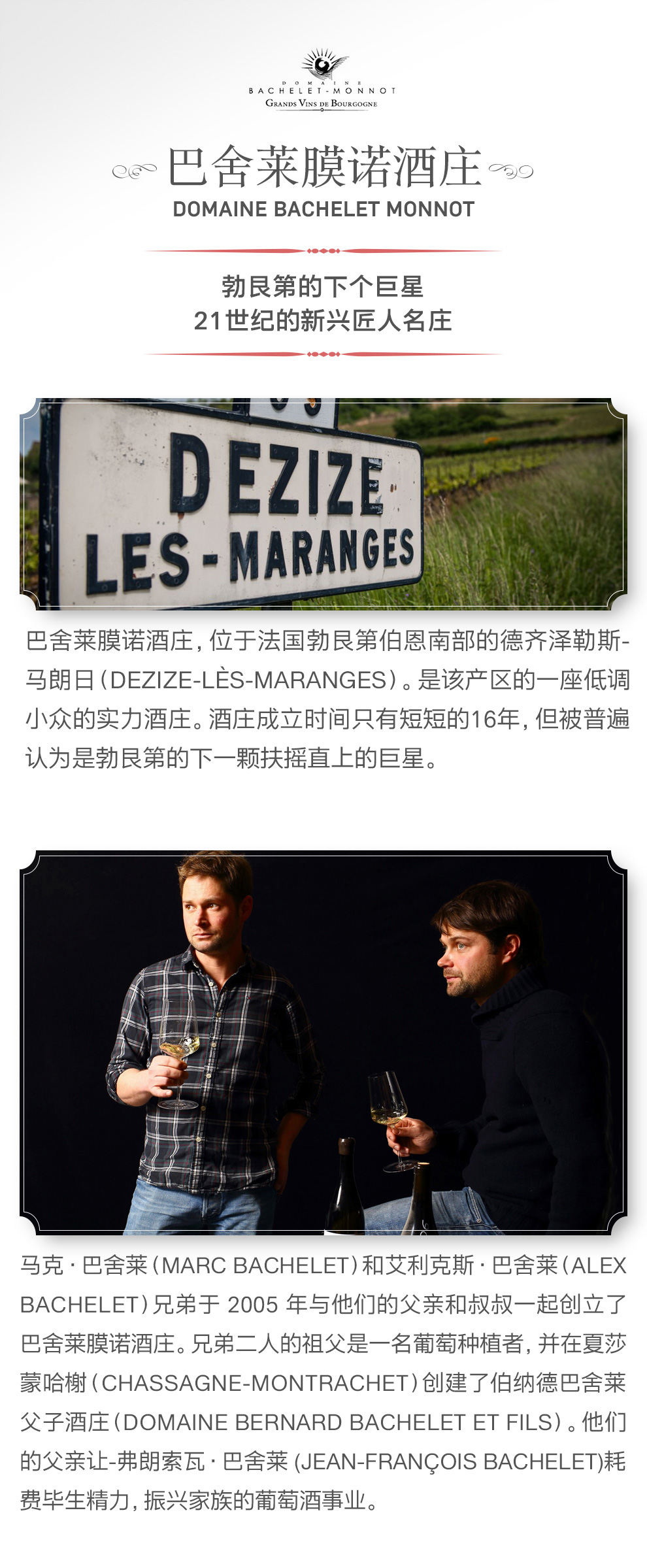 马克·巴舍莱(Marc Bachelet)和艾利克斯·巴舍莱(Alex Bachelet)兄弟于 2005 年与他们的父亲和叔叔一起创立了巴舍莱膜诺酒庄。马克和亚历克斯的祖父是一名葡萄种植者,并在夏莎蒙哈榭(Chassagne-Montrachet)创建了伯纳德巴舍莱酒庄(Domaine Bernard Bachelet et Fils)。他们的父亲让-弗朗索瓦·巴切莱特 (Jean-François Bachelet)耗费毕生精力,在勃艮第的家族葡萄园中酿酒。
