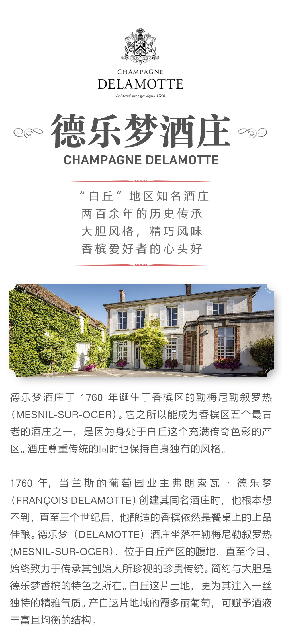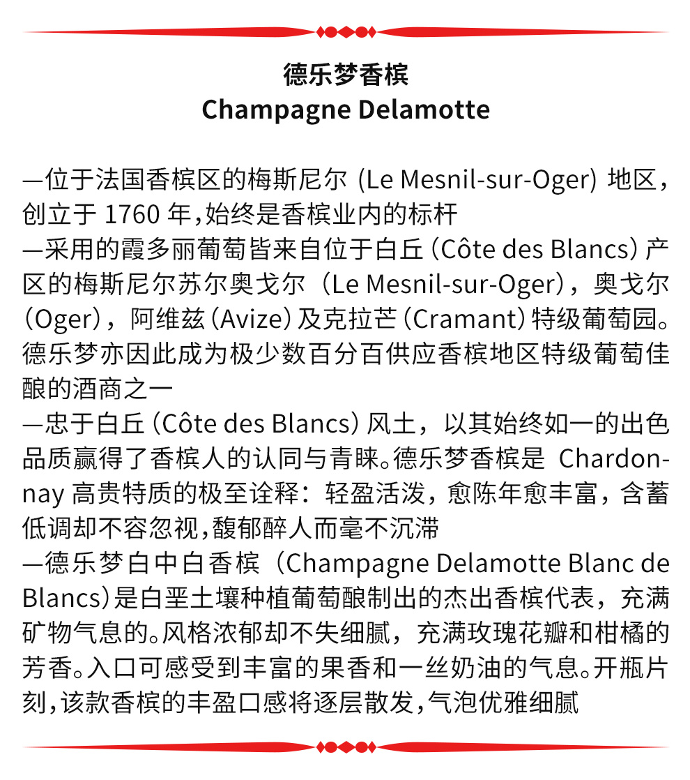 1760年,当兰斯的葡萄园业主弗朗索瓦·德乐梦(François Delamotte)创建其同名酒庄时,他根本想象不到,直至三个世纪后,他酿造的香槟依然是餐桌上的上品佳酿。德乐梦(Delamotte)酒庄坐落在勒梅尼勒叙罗热(Mesnil-sur-Oger),位于白丘产区的腹地,直至今日,始终致力于传承其创始人所珍视的珍贵传统。简约与大胆是德乐梦香槟的特色之所在。白丘这片土地,更为其注入一丝独特的精雅气质。产自这片地域的霞多丽葡萄口感强劲轻盈,可赋予酒液丰富且均衡的结构。