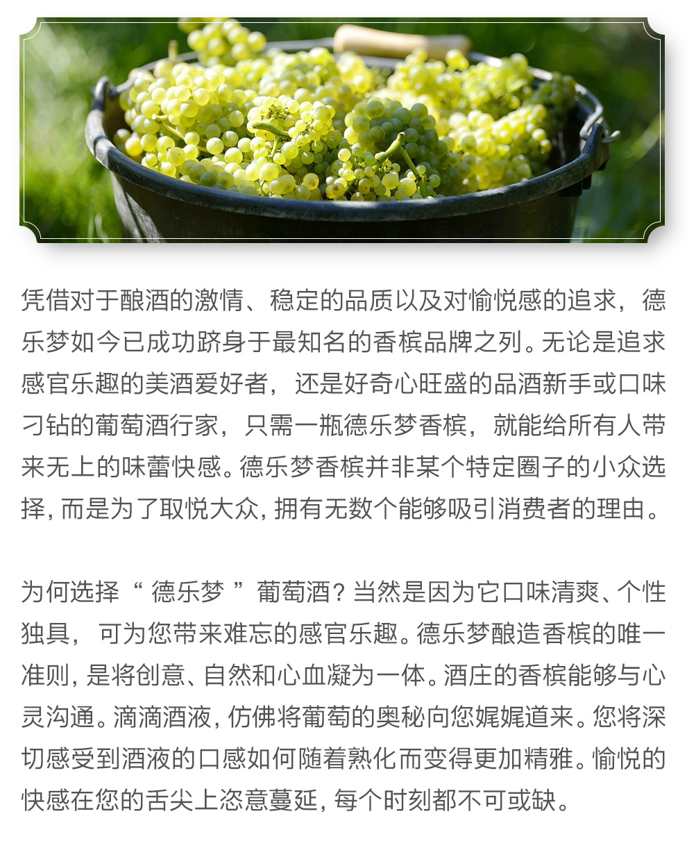 为何选择“德乐梦”葡萄酒?当然是因为它口味清爽、个性独具,可为您带来难忘的感官乐趣。德乐梦酿造香槟的唯一准则,是将创意、自然和心血凝为一体。酒庄的香槟能够与心灵沟通。滴滴酒液,仿佛将葡萄的奥秘向您娓娓道来。您将深切感受到酒液的口感如何随着熟化而变得更加精雅。愉悦的快感在您的舌尖上恣意蔓延,每个时刻都不可或缺。