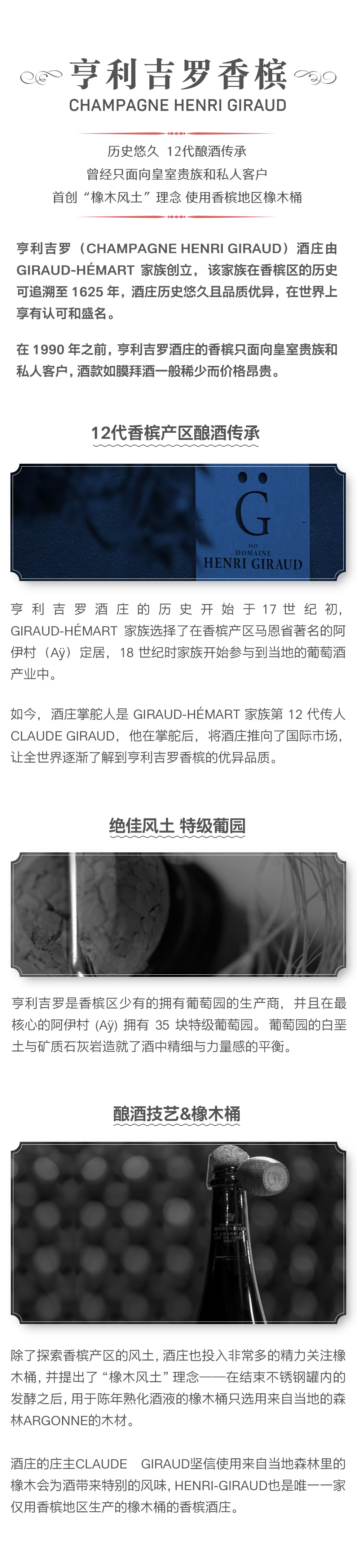 亨利吉罗是香槟区少有的拥有葡萄园的生产商,并且在最核心的阿伊村(Aÿ)拥有35块特级葡萄园。葡萄园的白垩土与矿质石灰岩造就了酒中精细与力量感的平衡。