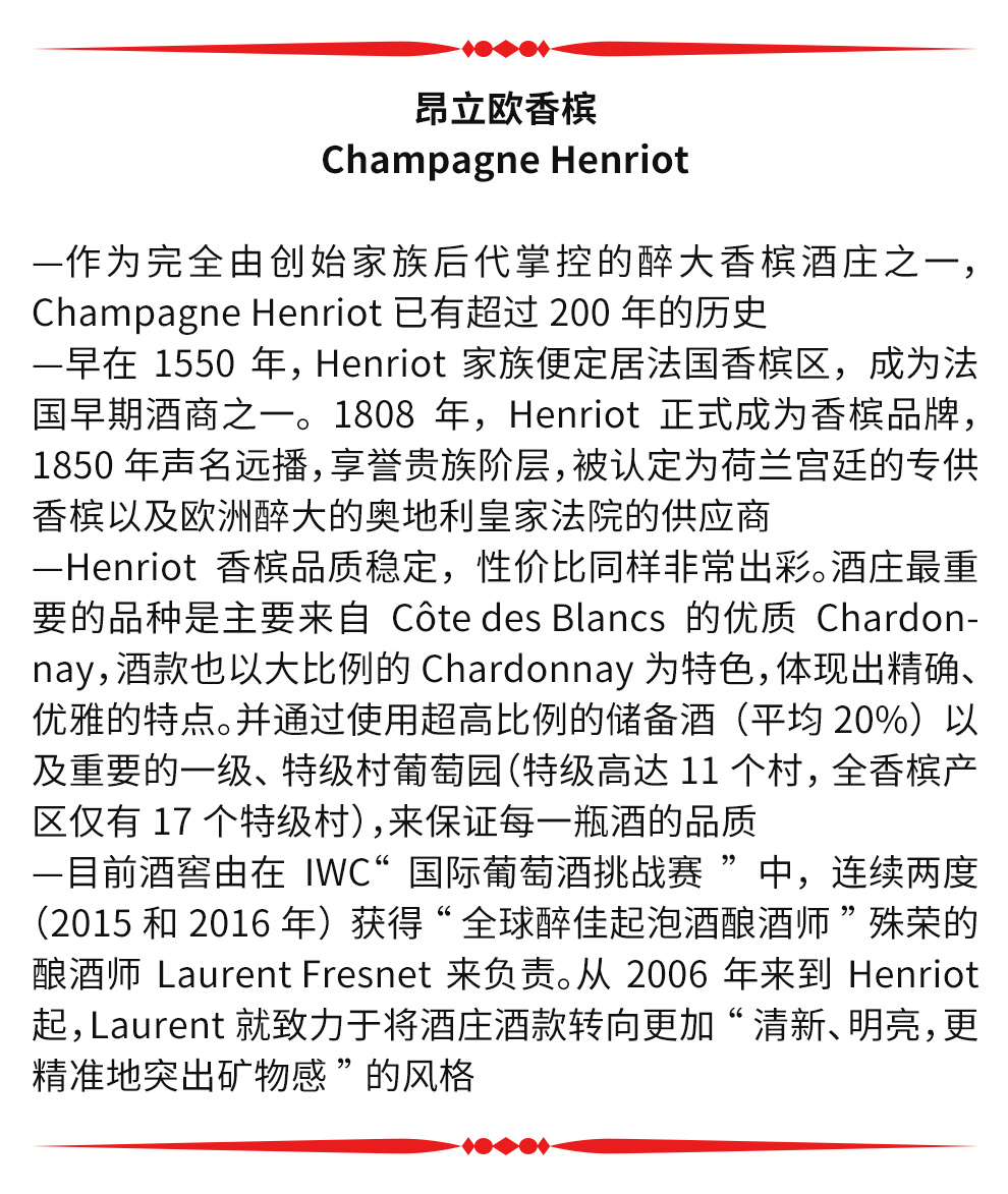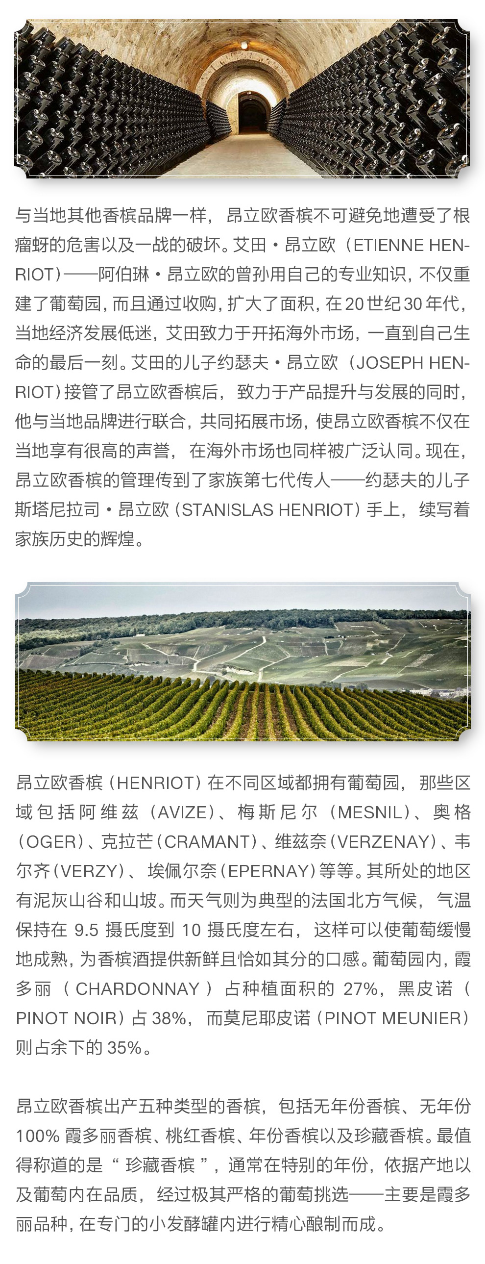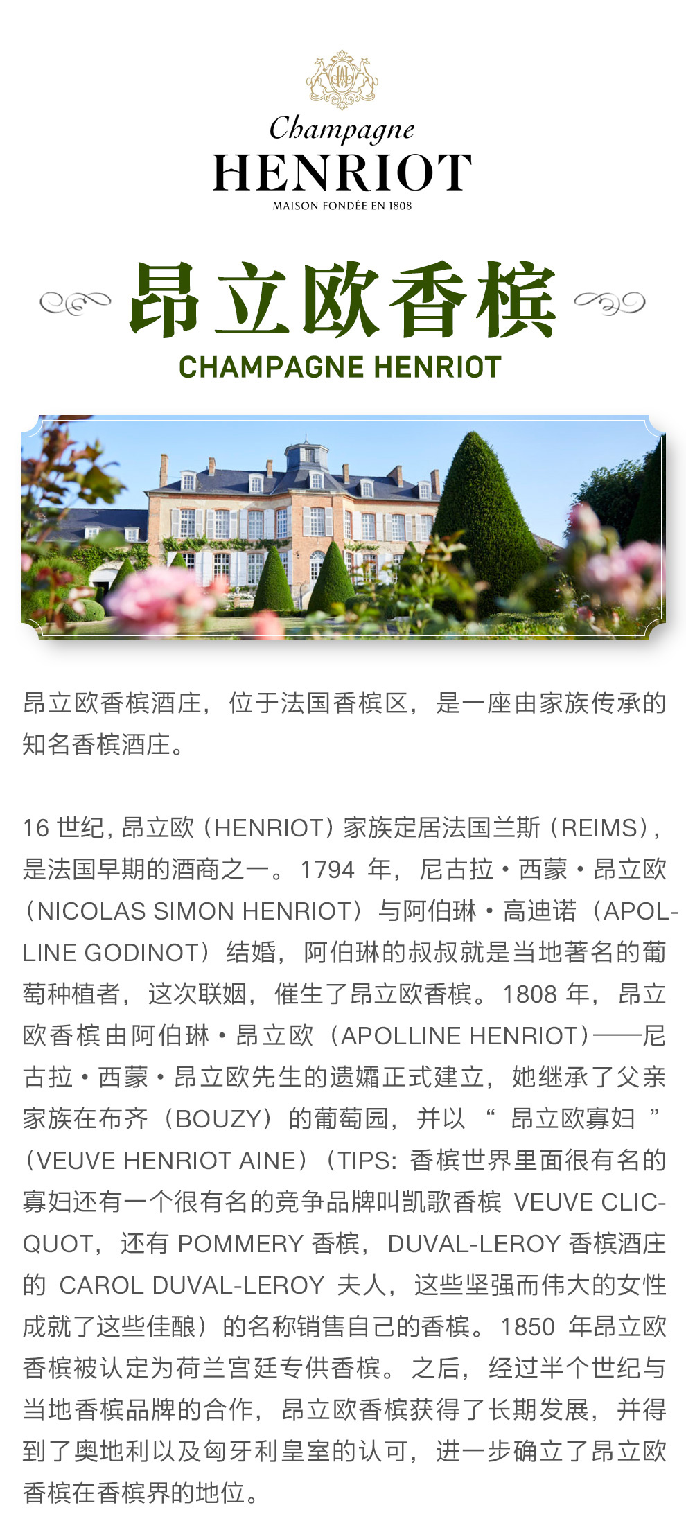 16世纪,昂立欧(Henriot)家族定居法国兰斯(Reims),是法国早期的酒商之一。1794年,尼古拉•西蒙•昂立欧(Nicolas Simon Henriot)与阿伯琳•高迪诺(Apolline Godinot)结婚,阿伯琳的叔叔就是当地著名的葡萄种植者,这次联姻,催生了昂立欧香槟。1808年,昂立欧香槟由阿伯琳•昂立欧(Apolline Henriot)——尼古拉•西蒙•昂立欧先生的遗孀正式建立,她继承了父亲家族在布齐(Bouzy)的葡萄园,并以“昂立欧寡妇” (Veuve Henriot Aine)(TIPS:香槟世界里面很有名的寡妇还有一个很有名的竞争品牌叫凯歌香槟Veuve Clicquot,还有Pommery香槟,