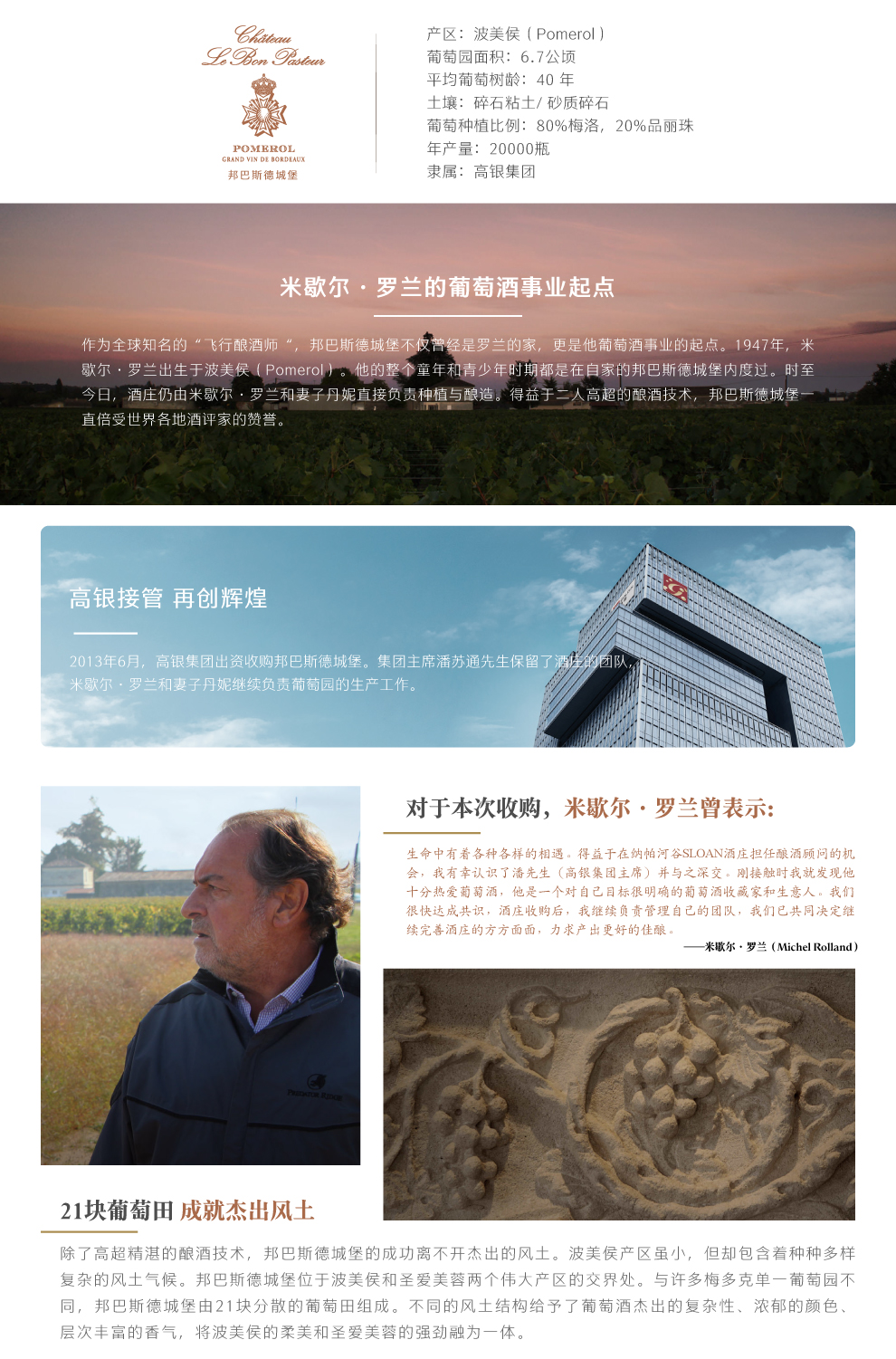 邦巴斯德酒庄主坐落在杰出的Pomerol和Saint Emilion产区边界, 以种植梅洛葡萄为主。由Joseph 和 Hermine Dupuy在1920年代创建。Le Bon Pasteur 意味牧羊人,牧羊人在圣经里拯救迷失信仰的人们。取名时是复活节下来第二个星期天,正是牧羊人日。