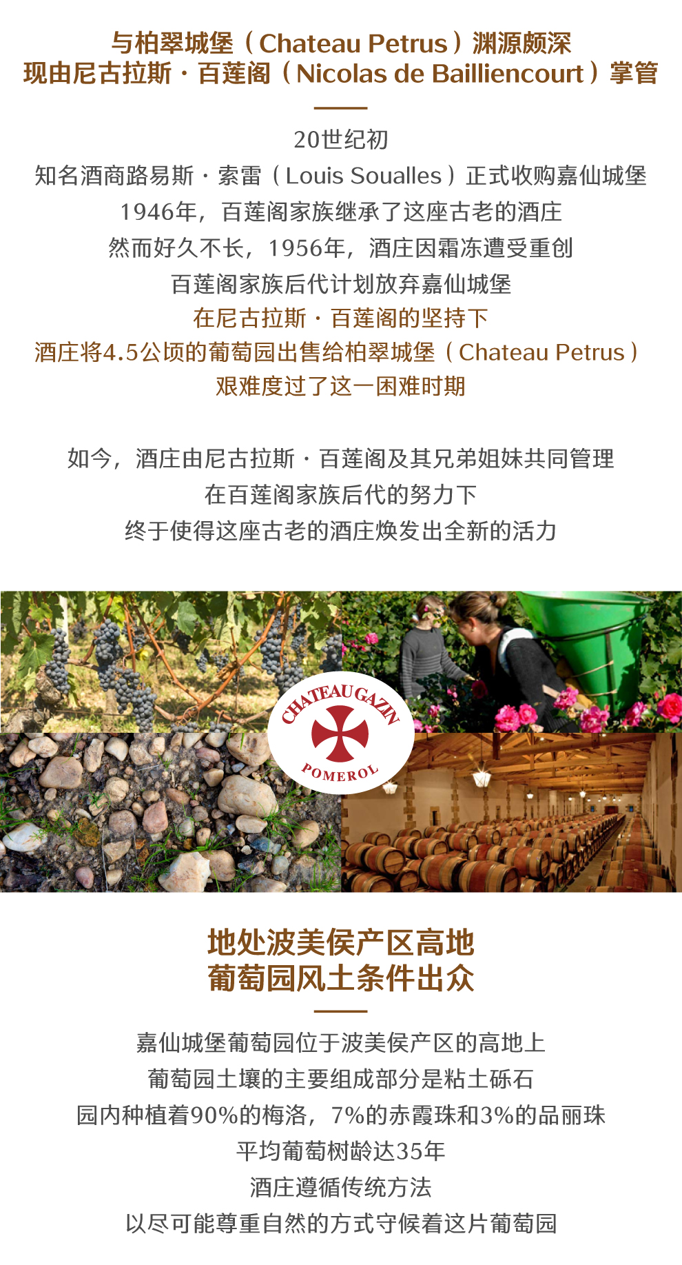 嘉仙酒庄的历史可以追溯至1214年,据说,该酒庄是在一些骑士的庇护下发展起来的。1741年,嘉仙酒庄被正式命名为“Chateau Gazin”。20世纪初,大酒商路易斯·索雷(Louis Soualles)收购了嘉仙酒庄。该富商一生热衷于追逐名庄,当时他已经有卓龙酒庄(Chateau Trotanoy)等多个名庄在手。