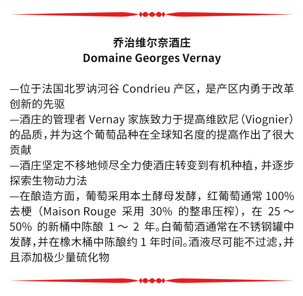 该酒庄的管理者Vernay家族致力于提高维欧尼(Viognier)的品质,并为这个葡萄品种在全球知名度的提高作出了很大贡献。酒庄名中的”Vernay“就是高质量维欧尼的意思。