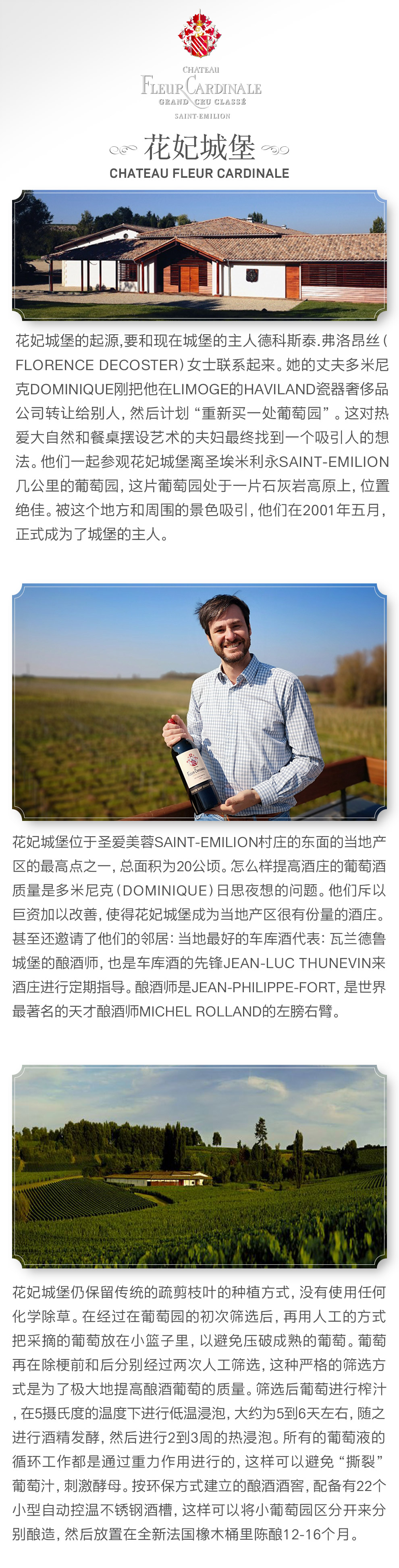 花妃城堡位于圣爱美蓉Saint-Emilion村庄的东面的当地产区的最高点之一,总面积为20公顷。怎么样提高酒庄的葡萄酒质量是多米尼克(Dominique)日思夜想的问题。他们斥以巨资加以改善,使得花妃城堡成为当地产区很有份量的酒庄。甚至还邀请了他们的邻居:当地最好的车库酒代表:瓦兰德鲁城堡的酿酒师,也是车库酒的先锋Jean-Luc Thunevin来酒庄进行定期指导。酿酒师是Jean-Philippe-Fort,是世界最著名的天才酿酒师Michel Rolland的左膀右臂。