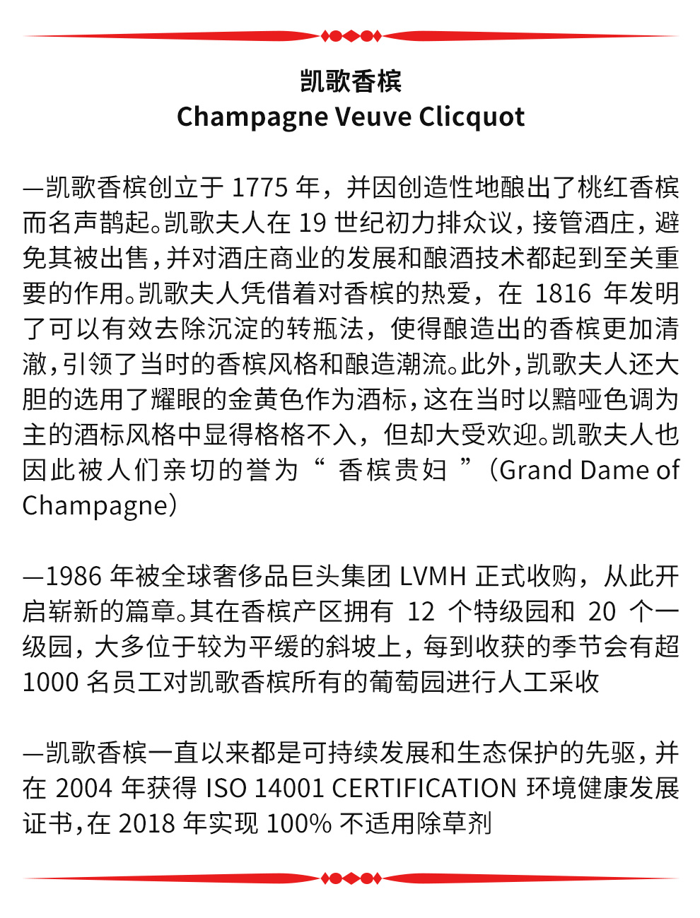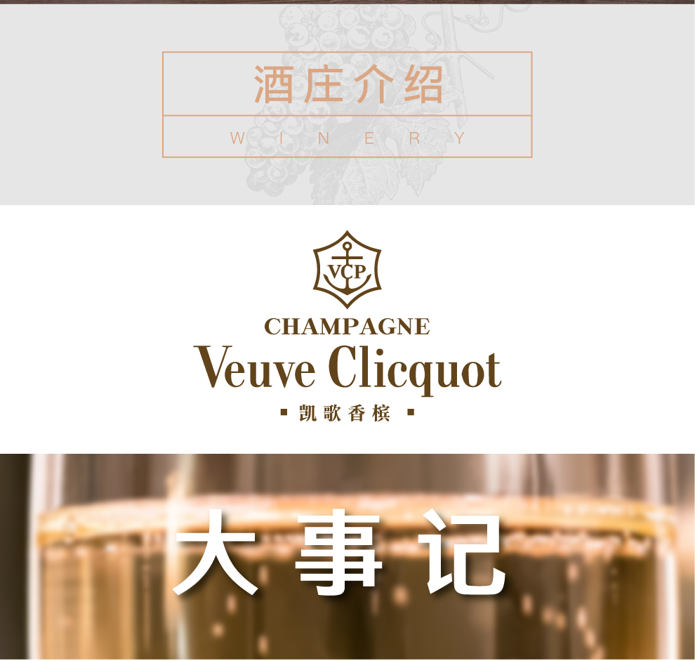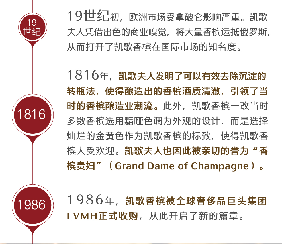 在追求完美和勇于创新的信念驱动下,凯歌夫人于1816年发明了有效去除沉淀的转瓶法,酿造出酒质清澈,品质超群的香槟酒,这举世瞩目的技术革新引领了香槟酿造业的潮流。200年前,当大部分酒标都选用黯哑的色调时,凯歌夫人选用灿烂的金黄色作为凯歌香槟的标志,这项伟大的创举让凯歌香槟由内而外表现得更加杰出!她的进取精神和睿智果敢也得到了世人的认同,被亲切地誉为“香槟贵妇” (Grand Dame of Champagne)。1986年,凯哥香槟被世界顶级奢侈品公司路易·威登(LVMH)集团收购。