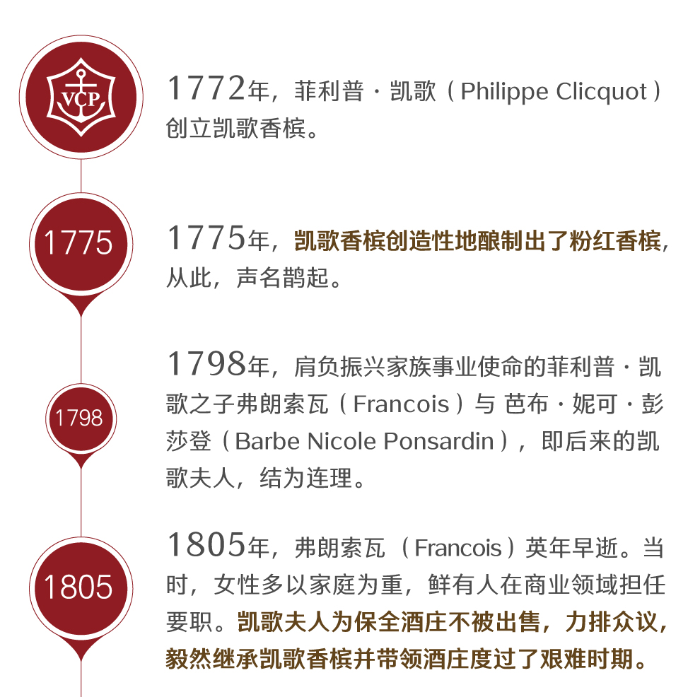 凯歌夫人的公公——菲利普·凯歌(Philippe Clicquot)在法国北部创立了这个品牌。1775年,凯歌香槟就创造性地酿制出了世界上第一款粉红香槟,从那时起,凯歌香槟便成为了粉红香槟酿制的标准。1798年,肩负振兴家族事业使命的菲利普·凯歌之子弗朗索瓦(Francois)与 芭布·妮可·彭莎登(Barbe Nicole Ponsardin),即后来的凯歌夫人,结为连理。1805年,弗朗索瓦 (Francois)英年早逝,他年仅27岁的遗孀——凯歌夫人,力排众议,不顾世俗的眼光和怀疑,毅然继承了丈夫的事业。她以充沛过人的精力,睿智果敢的勇气和活泼智慧的心灵,带领凯歌香槟走过了最艰辛的时期。19世纪初,欧洲处在拿破仑(Nepoleon)的封锁当中,凯歌夫人机智地突破贸易封锁,将大量香槟运抵俄罗斯,这些销往俄罗斯的“幸运之酒”,大振凯歌的声威。