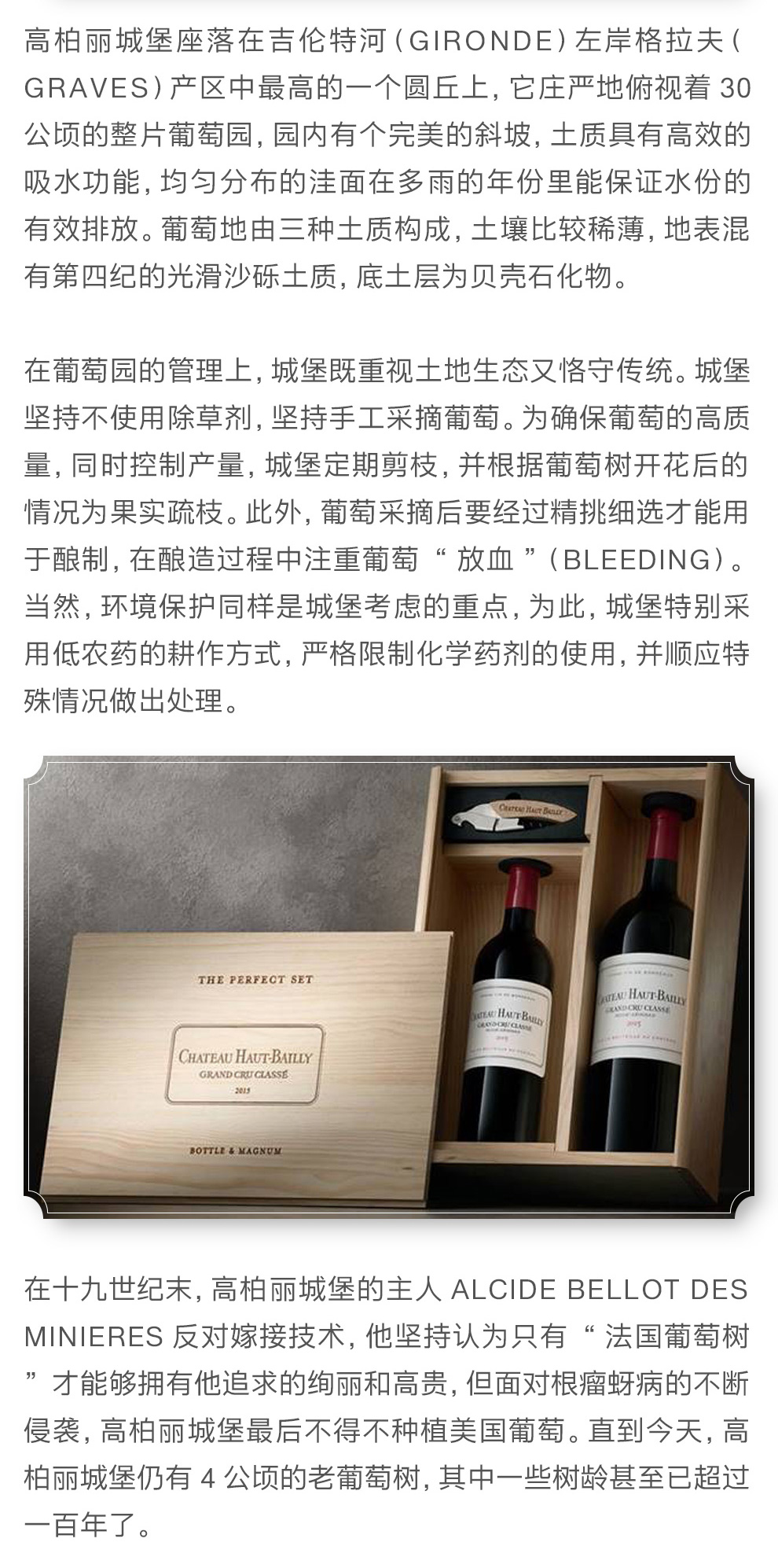 高柏丽城堡座落在吉伦特河(Gironde)左岸格拉夫(Graves)产区中最高的一个圆丘上,它庄严地俯视着30公顷的整片葡萄园,园内有个完美的斜坡,土质具有高效的吸水功能,均匀分布的洼面在多雨的年份里能保证水份的有效排放。葡萄地由三种土质构成,土壤比较稀薄,地表混有第四纪的光滑沙砾土质,底土层为贝壳石化物。