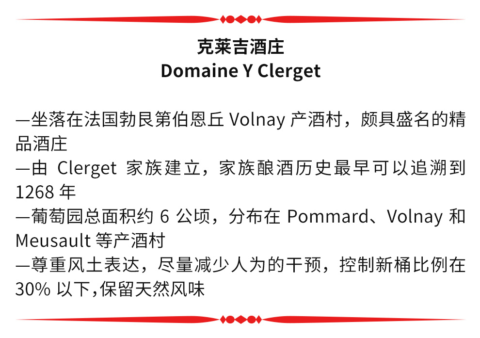 克莱吉酒庄(Domaine Y Clerget)坐落在法国勃艮第伯恩丘(Cote de Beaune)产区的沃奈(Volnay)村。克莱吉酒庄是当地一座颇具盛名的精品酒庄,以出产高品质的勃艮第红、白葡萄酒而闻名。