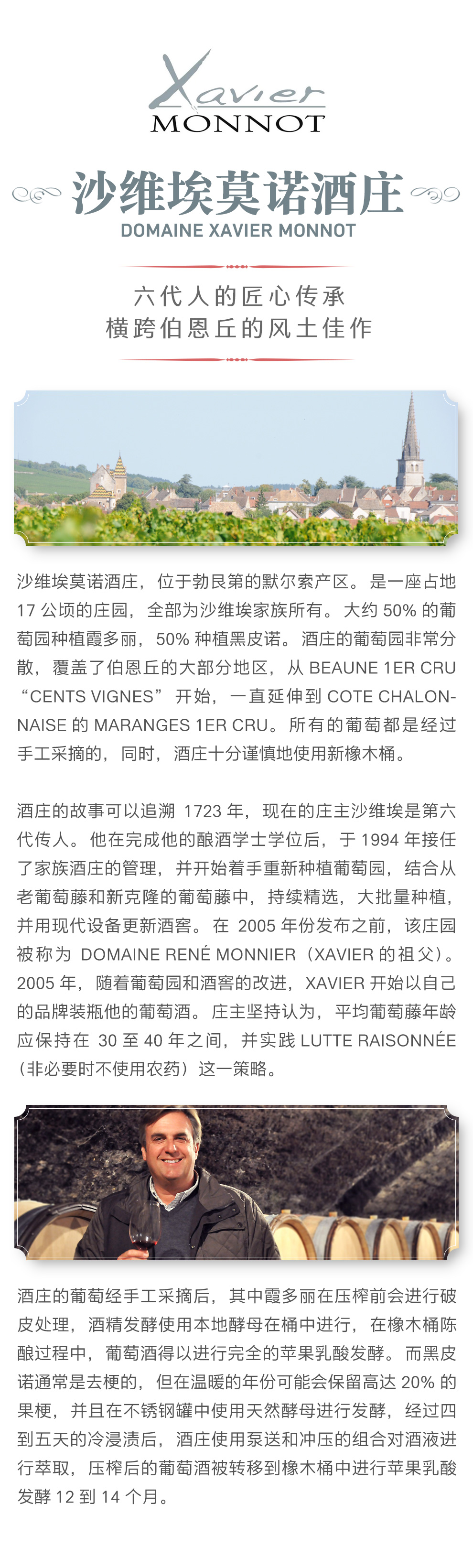 酒庄的故事可以追溯1723 年,现在的庄主沙维埃是第六代传人。他在完成他的酿酒学士学位后,于 1994 年接任了家族酒庄的管理,并开始着手重新种植葡萄园,结合从老葡萄藤和新克隆的葡萄藤中,持续精选,大批量种植,并用现代设备更新酒窖。在2005 年份发布之前,该庄园被称为Domaine René Monnier(Xavier 的祖父)。2005 年,随着葡萄园和酒窖的改进,Xavier 开始以自己的品牌装瓶他的葡萄酒。庄主坚持认为,平均葡萄藤年龄应保持在30 至 40 年之间,并实践 lutte raisonnée(非必要时不使用农药)这一策略。