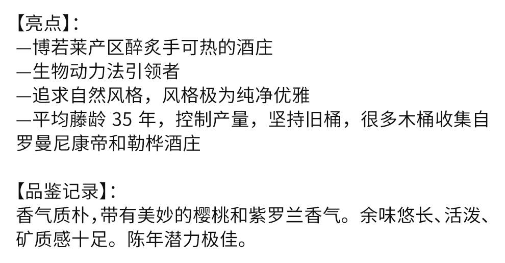 葡萄园完全不使用任何化学药剂,在酿造过程中,酒庄从不添加人工酵母,也不进行补糖、加酸、过滤、澄清等操作,二氧化硫也极少添加,有些年份甚至零添加。Jean Foillard坚持使用旧桶陈放葡萄酒,所有的旧桶都来自于勃艮第的鼎尖酒庄。让福雅酒庄墨贡杜派干红葡萄酒(DOMAINE JEAN FOILLARD MORGON COTE DU PY )是庄的旗舰酒款,也是佳美葡萄品种的优秀代表,在博若莱产区品质位列前列。这款酒香气浓郁,有相当优秀的陈年潜力,年轻时单宁柔细,风味复杂而有深度,是产区的代表佳作。
