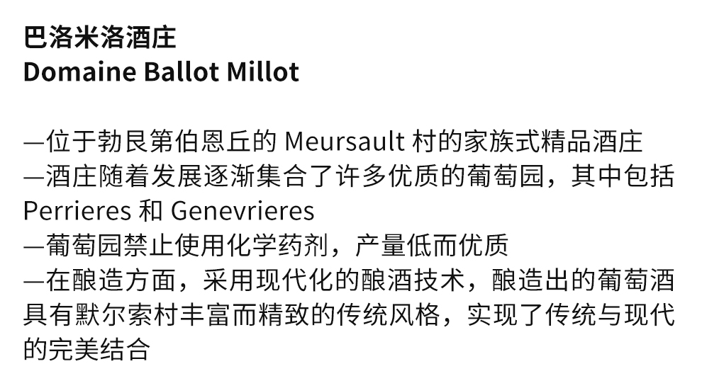 巴洛米洛酒庄(Domaine Ballot Millot)位于法国著名葡萄酒产区勃艮第(Burgundy)伯恩丘(Cote de Beaune)的默尔索(Meursault)村,是该产区内的一座家族式精品酒庄。