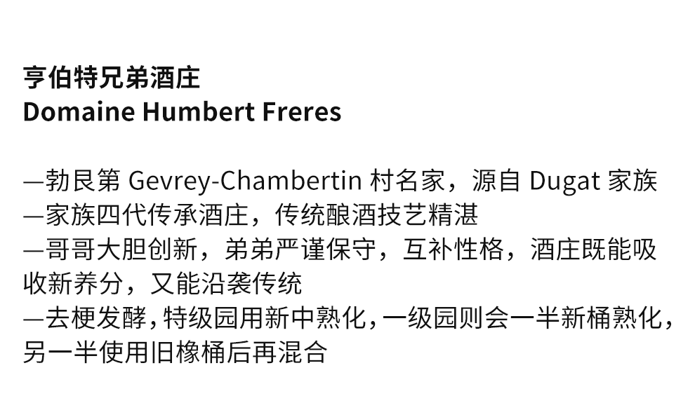 亨伯特兄弟酒庄在哲伏-香贝丹产区一共有4个一级园和1个特级园。这些葡萄园位于不同的区域,拥有多样的风土特色。