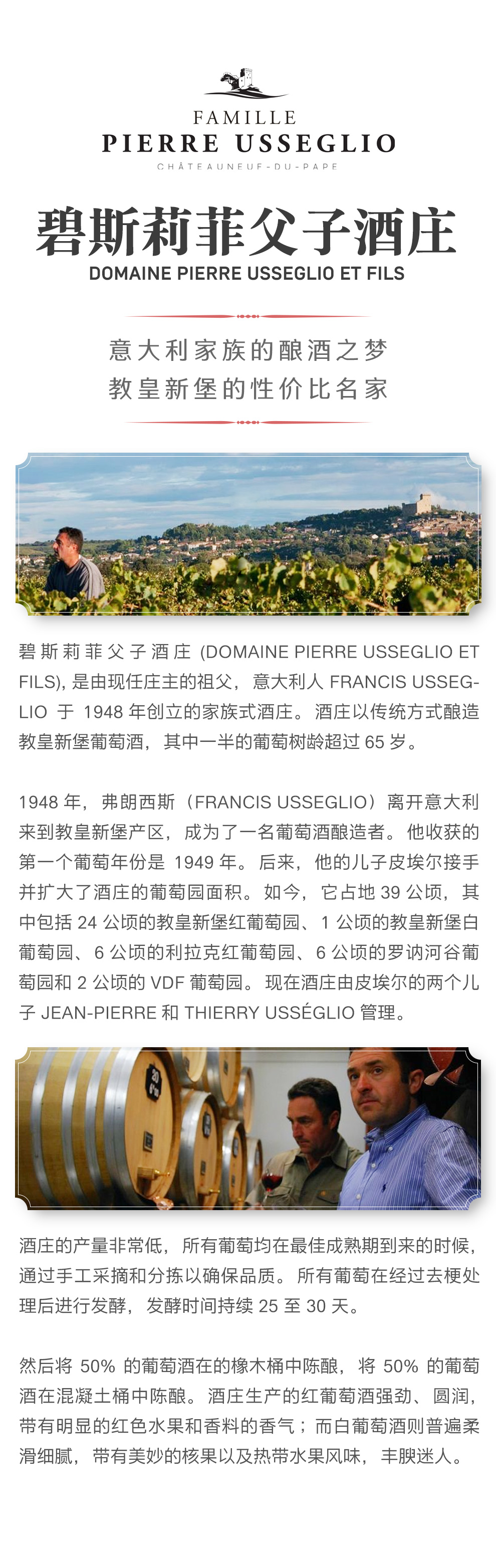 碧斯莉菲父子酒庄(DOMAINE PIERRE USSEGLIO ET FILS),是由现任庄主的祖父,意大利人Francis USSEGLIO于1948 年创立的家族式酒庄。酒庄以传统方式酿造教皇新堡葡萄酒,其中一半的葡萄树龄超过65岁。