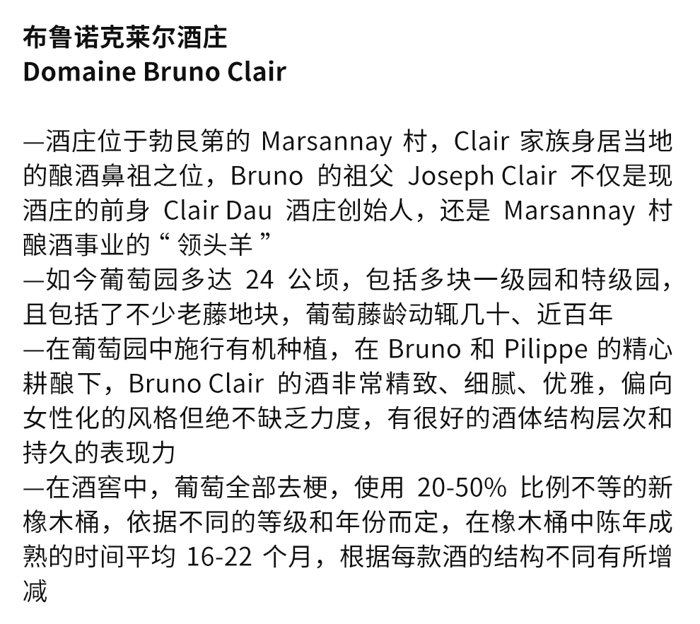 布鲁诺·克莱尔酒庄由布鲁诺·克莱尔(Bruno Clair)创建于1979年,坐落在金丘(Cote d'Or)最北端的马沙内(Marsannay)村。布鲁诺的祖父是著名的克莱尔-达宇酒庄(Clair-Dau Estate)的创始人,但受制于法国的继承法,布鲁诺的父亲没能够继承该酒庄的大部分财产,取而代之的第一继承人是布鲁诺的姑姑。由于她经营不善,克莱尔-达宇酒庄最终被路易亚都酒庄(Maison Louis Jadot)收购。1986年, 布鲁诺受家人所托接管克莱尔-达宇酒庄仅存的一小部分财产,并竭尽所能恢复家族以往的荣光。布鲁诺年轻有为,为人和善,受他的邀请,极富才华的酿酒师菲利普·布朗(Philippe Brun)来到酒庄酿酒。如今,两人的合作已长达25年。在他们的共同努力之下,酒庄葡萄园的面积已经扩展到24公顷,而酒庄出品的酒款则多达24种。