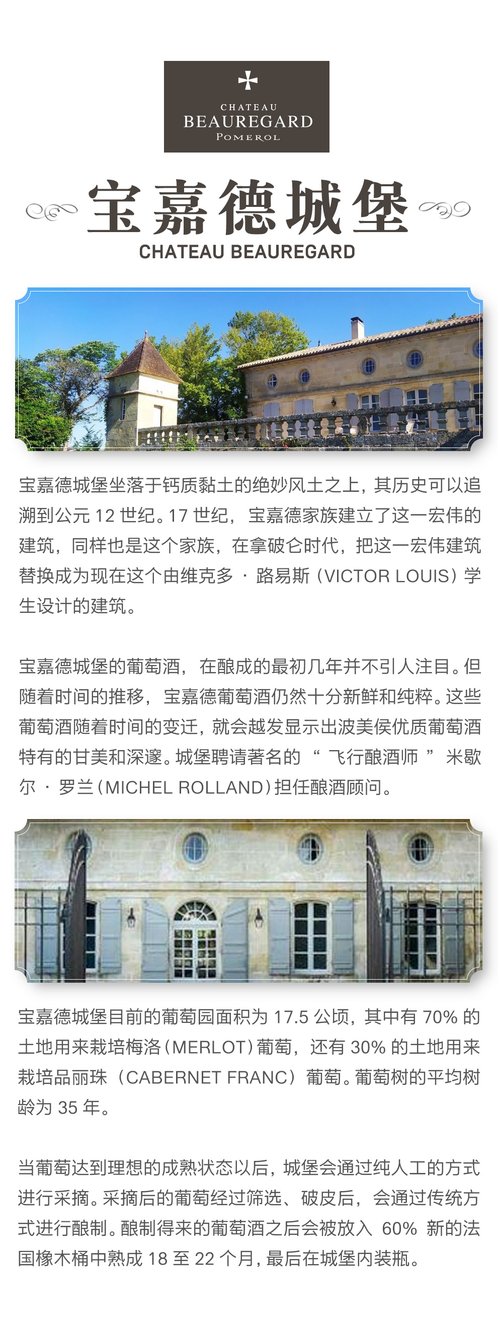 宝嘉德城堡的葡萄酒,在酿成的最初几年并不引人注目。但随着时间的推移,宝嘉德葡萄酒仍然十分新鲜和纯粹。这些葡萄酒随着时间的变迁,就会越发显示出波美侯优质葡萄酒特有的甘美和深邃。城堡聘请著名的“飞行酿酒师”米歇尔·罗兰(Michel Rolland)担任酿酒顾问。