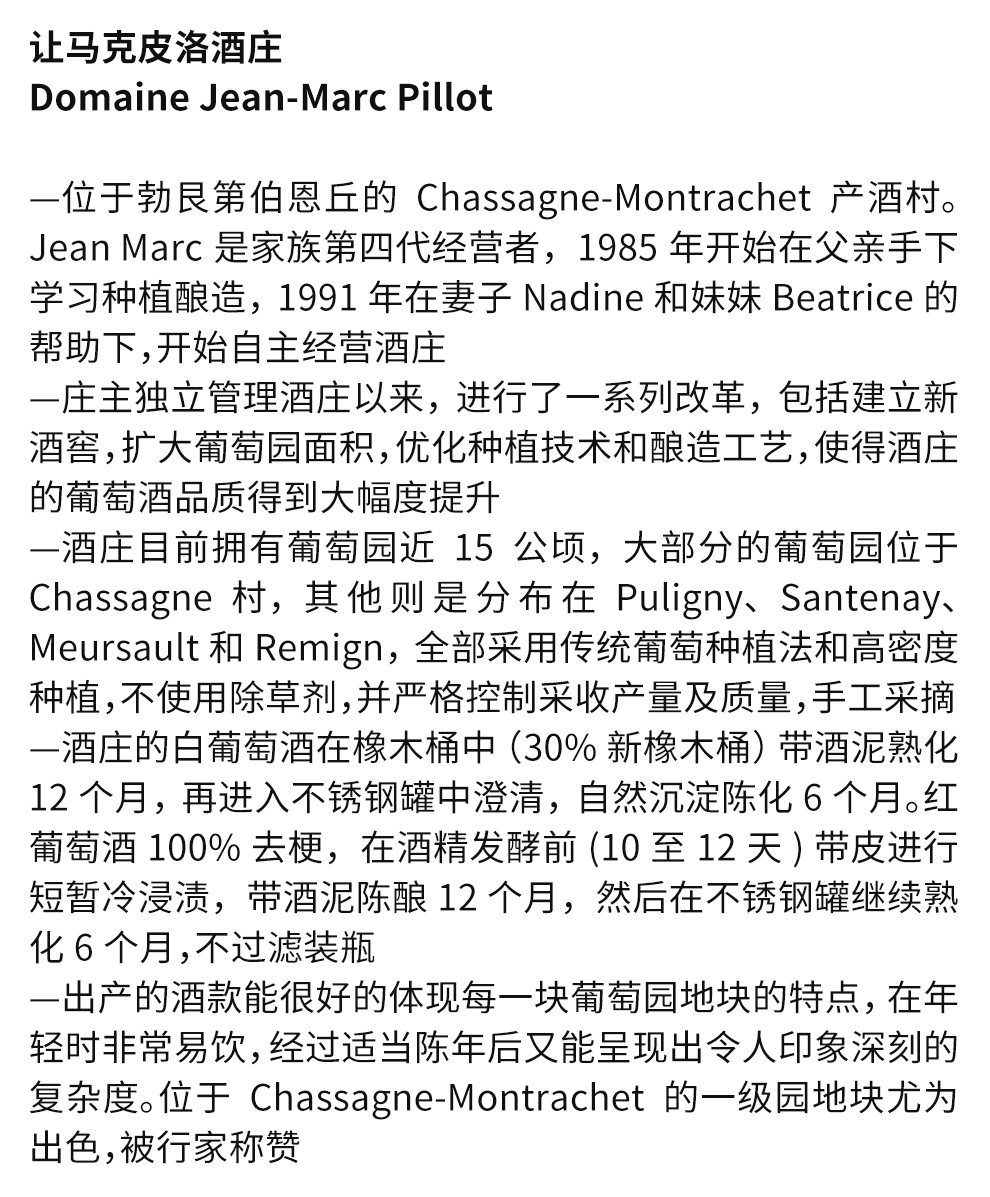 让-马克·皮洛酒庄(Domaine Jean-Marc Pillot)位于法国勃艮第(Burgundy)伯恩丘(Cote de Beaune)的夏山-蒙哈榭(Chassagne-Montrachet)产酒村,是该村一座家族经营的精品酒庄。1991年,让-马克接管酒庄,他是酒庄的第四代传人。上任后,让-马克对酒庄实施了一些改革措施,包括建造新酒窖,优化种植技术和酿造工艺,使葡萄酒的品质变得越来越好,提升了酒庄在行业内的地位。
