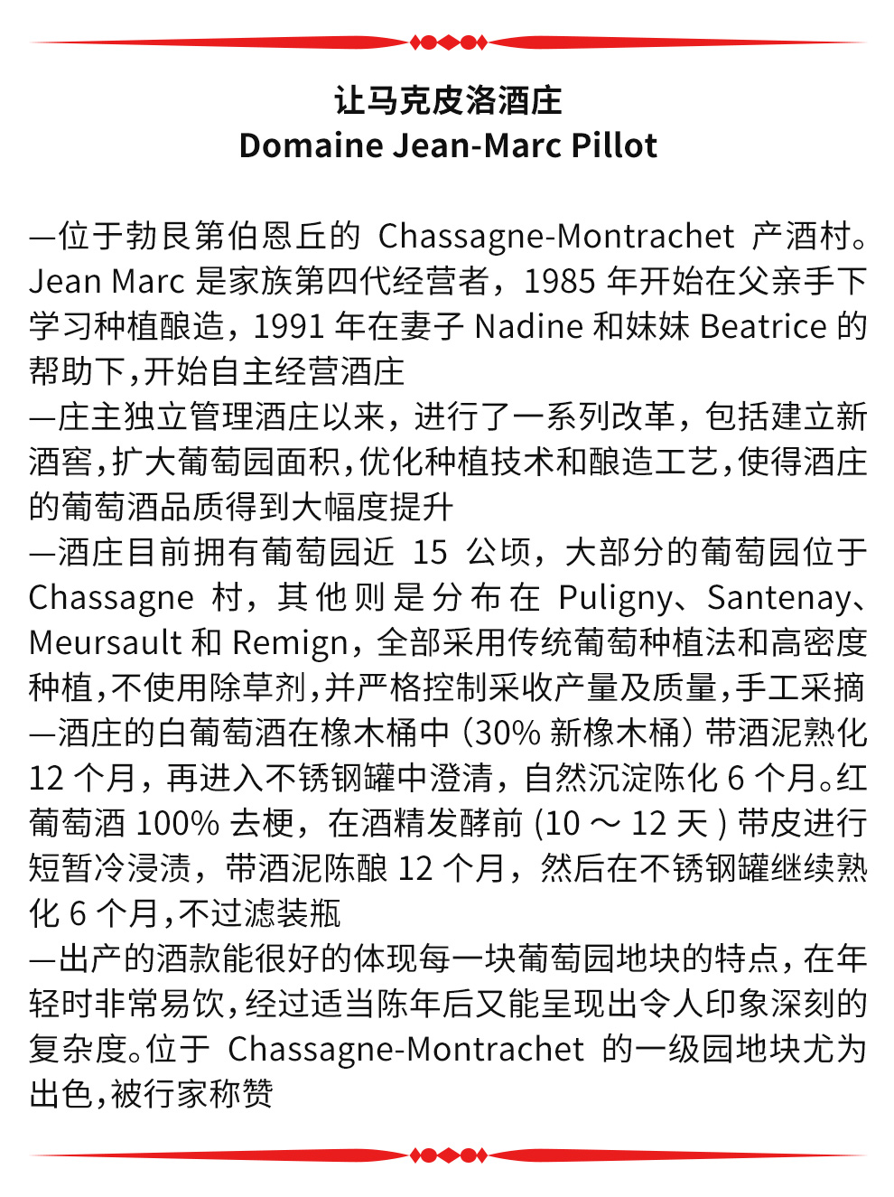 让-马克·皮洛酒庄(Domaine Jean-Marc Pillot)位于法国勃艮第(Burgundy)伯恩丘(Cote de Beaune)的夏山-蒙哈榭(Chassagne-Montrachet)产酒村,是该村一座家族经营的精品酒庄。1991年,让-马克接管酒庄,他是酒庄的第四代传人。上任后,让-马克对酒庄实施了一些改革措施,包括建造新酒窖,优化种植技术和酿造工艺,使葡萄酒的品质变得越来越好,提升了酒庄在行业内的地位。