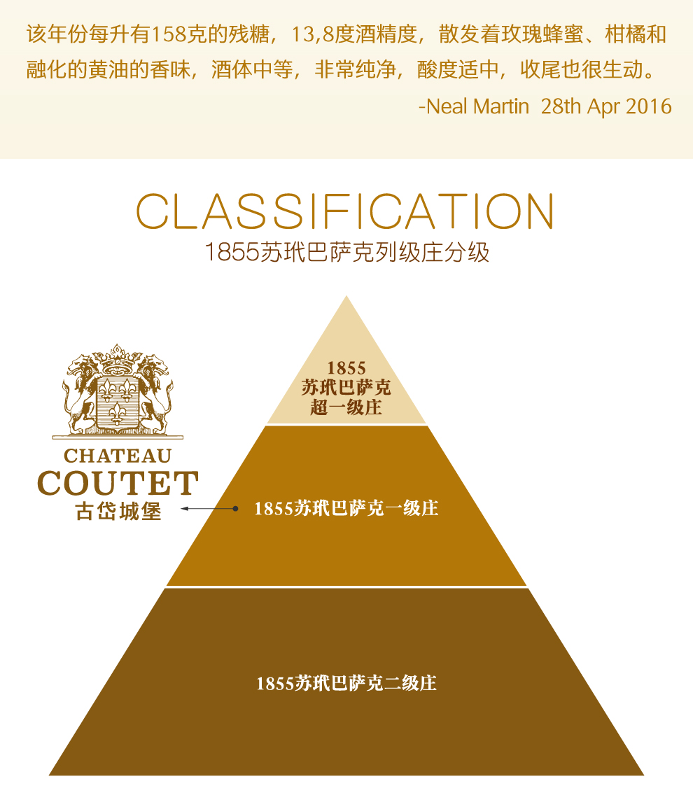 酒庄名称:古岱城堡(Château Coutet) 法定产区:巴萨克法定产区( Barsac ) 等级: 1855苏玳和巴萨克一级庄