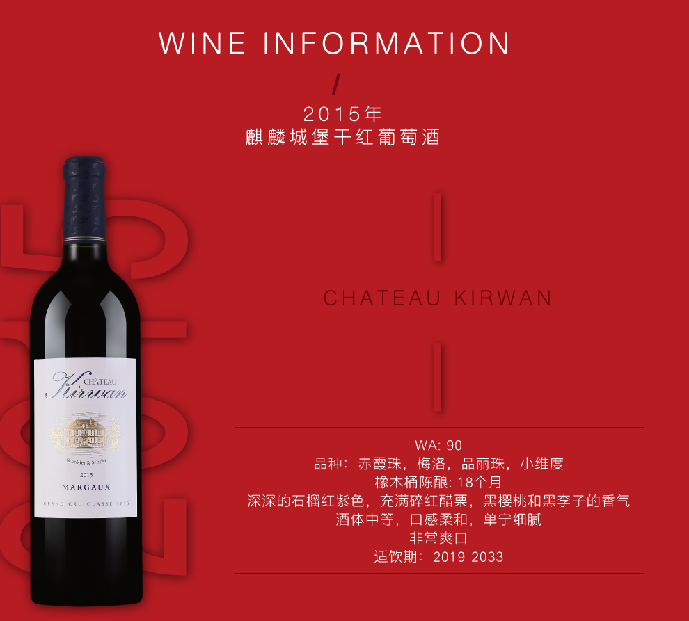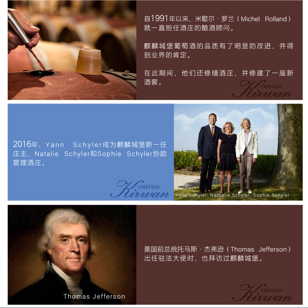 麒麟酒庄(Chateau Kirwan) 的名字可追溯至18世纪,它原属于一位名叫利纳德•赛尔(Renard de la Salle)的波尔多贵族所有。1710年,酒庄的所有权转到约翰•柯林武德(John Collingwood)手中。后来,柯林武德的女儿与一位名叫马克•麒麟(Mark Kirwan)的爱尔兰人结婚,酒庄从此便有了一个新的名字——麒麟酒庄。马克为麒麟酒庄树立了很好的声誉,当时的法国大使,即后来的美国总统托马斯 · 杰弗逊(Thomas Jefferson)也曾经拜访过麒麟酒庄。大革命爆发后,酒庄于1789年被没收,马克本人得益于其出生国而幸免于难。随后在拿破仑统治时期,酒庄又重新回到他手里,而且还在扩展的同时合并了邻近的加纳酒庄(Chateau Ganet)。这是麒麟酒庄唯一一次变动的主要葡萄园区域,如今酒庄仍然保持着拿破仑时期的风貌。
