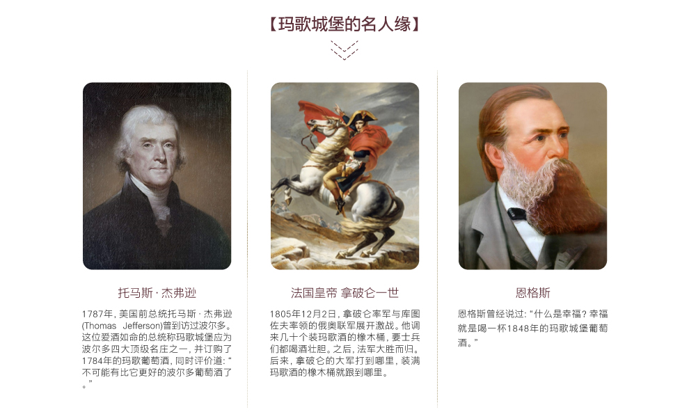 作为玛歌村中最灿烂的一颗明珠,古往今来,玛歌酒庄为无数名人挚爱,如 拿破仑、美国前总统托马斯·杰弗逊等等。
