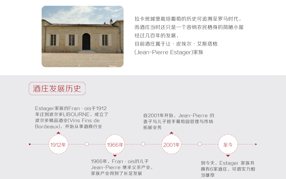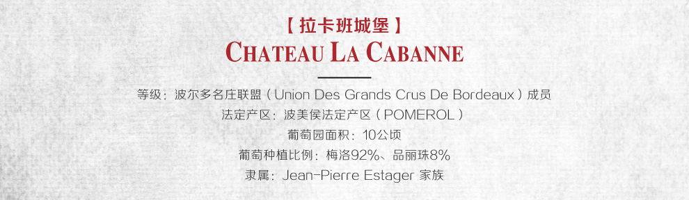 拉卡班酒庄是属于让皮埃尔 · 艾斯塔格(Jean-Pierre Estager)家族的产业,位于波美侯产区的中心,其栽培葡萄的历史可追溯至罗马时代,当时孤立的小屋就是那些种植葡萄的农民们的栖身之所。