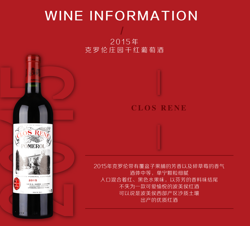克罗伦酒庄(Clos Rene)位于久负盛名的法国波尔多产区的子产区波美侯(Pomerol)产区,是该产区内历史最悠久的酒庄之一。