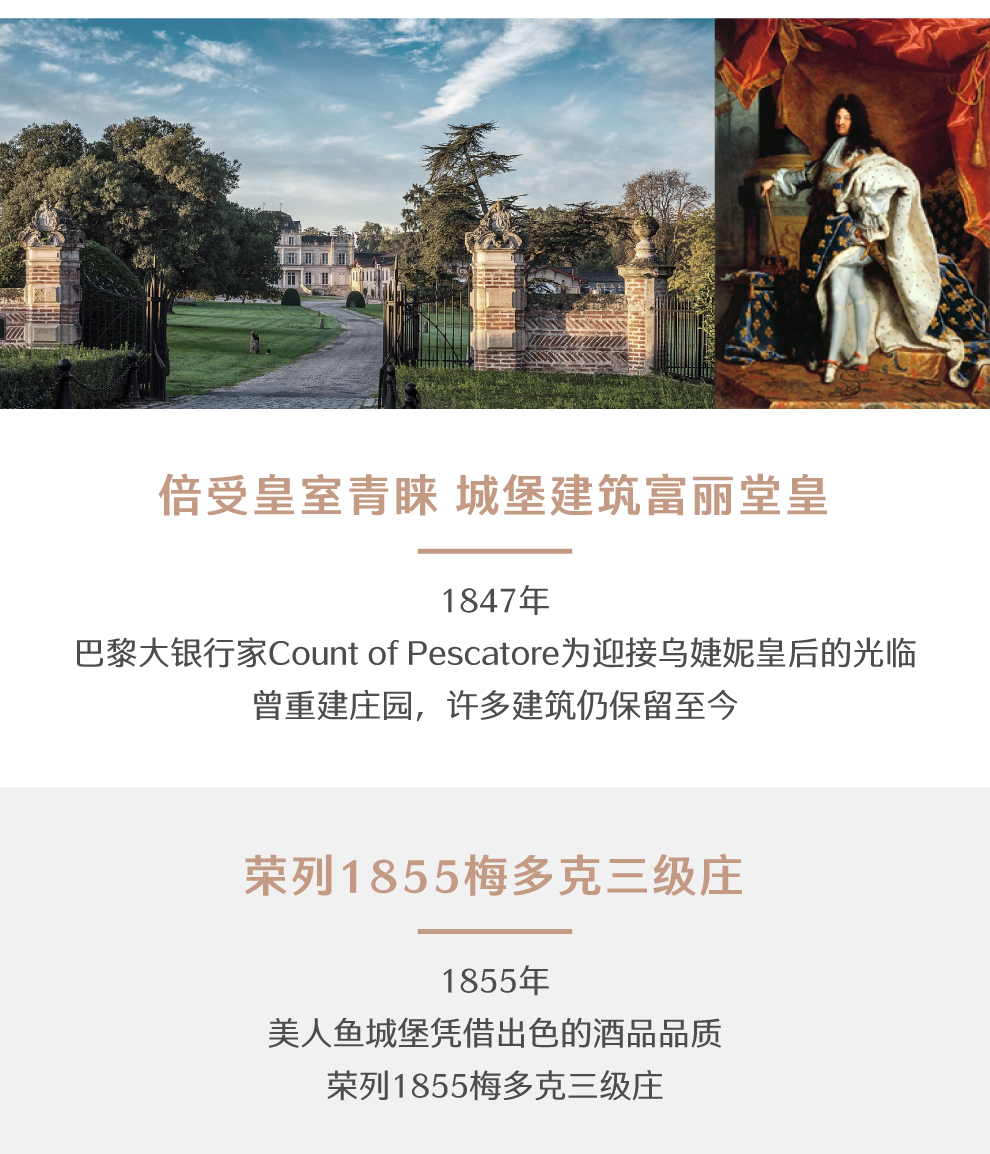 美人鱼城堡是一家历史悠久的酒庄,最早可追溯至1330年。两个世纪后的1552年,该酒庄以1,000英镑的价格卖给了皮埃尔•罗姆(Pierre L‘Homme)。在出售文书上,美人鱼酒庄已标明为一个葡萄园。法国酒书Feret(被看作是波尔多葡萄酒的《圣经》)中曾记载,路易XIV国王非常喜欢美人鱼酒庄的葡萄酒,所以酒庄的酒常侍君左右。又过了两个世纪,酒庄为圣西门(Saint-Simon)家族所有,不过没多久,1789年法国大革命时期酒庄没能逃脱被没收充公的命运。随后酒庄曾多次易主,庄主之一,巴黎大银行家Count of Pescatore为迎接乌婕妮皇后的光临,曾于1847年重建庄园,许多建筑仍保留至今。
