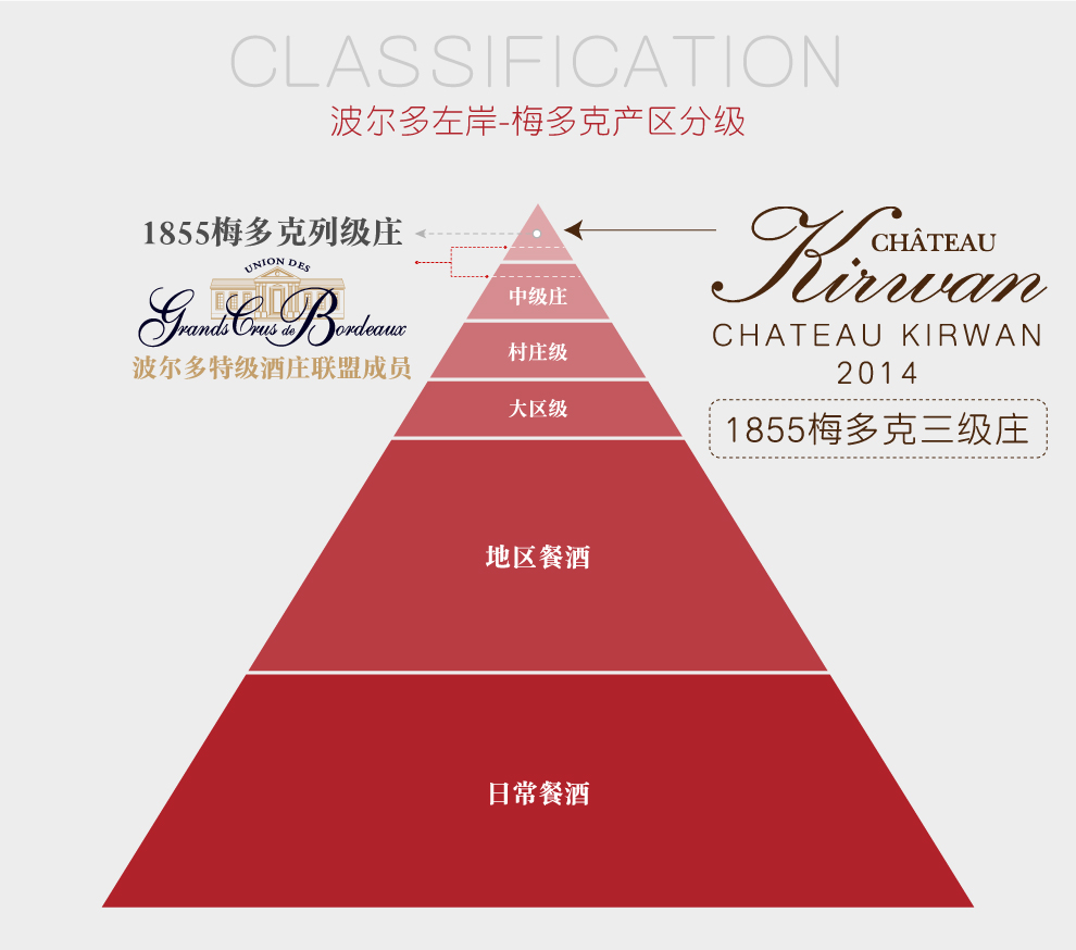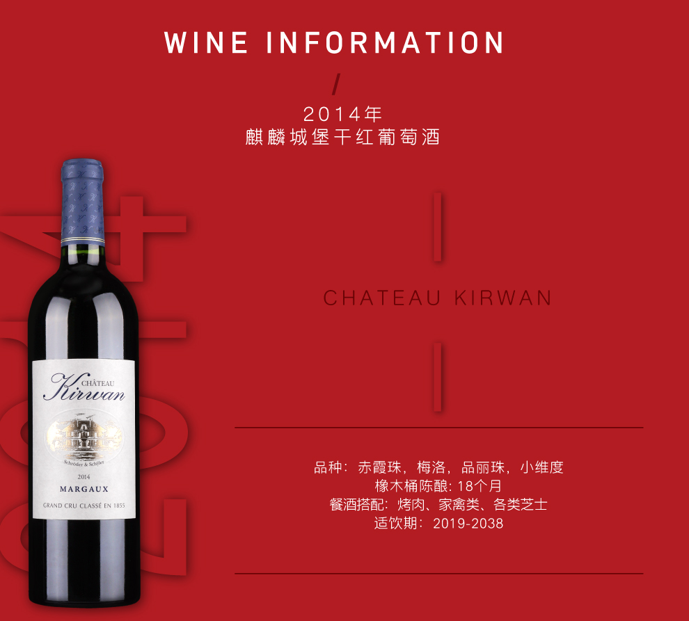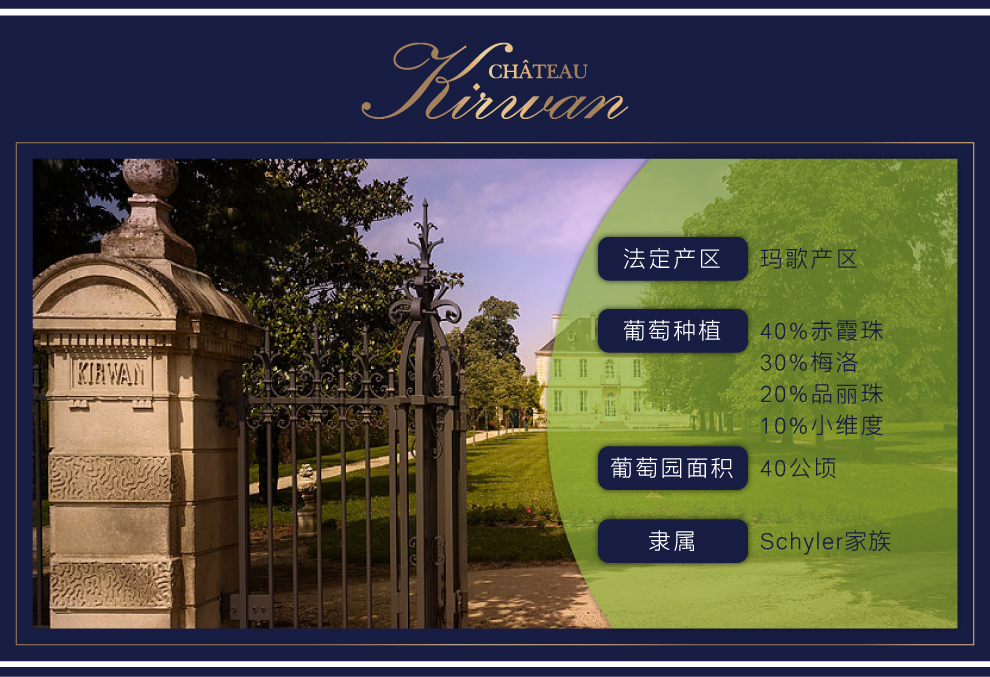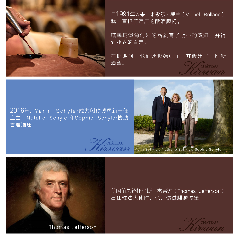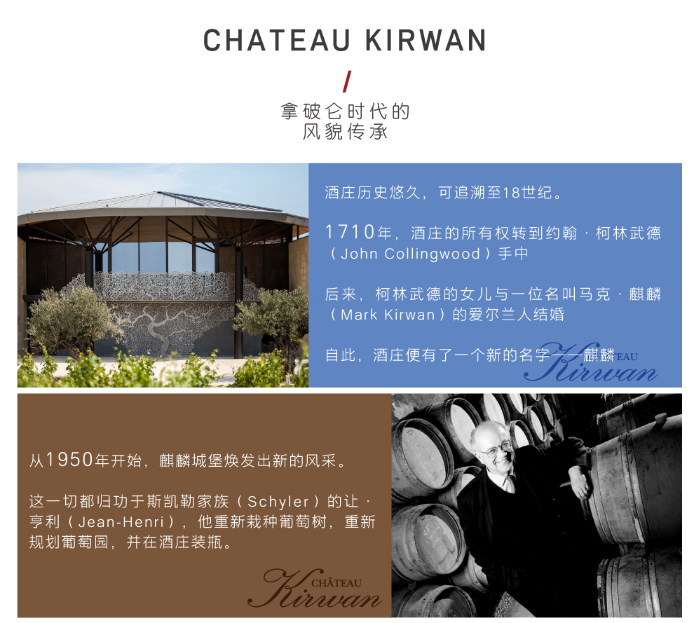 麒麟酒庄(Chateau Kirwan) 的名字可追溯至18世纪,它原属于一位名叫利纳德•赛尔(Renard de la Salle)的波尔多贵族所有。1710年,酒庄的所有权转到约翰•柯林武德(John Collingwood)手中。后来,柯林武德的女儿与一位名叫马克•麒麟(Mark Kirwan)的爱尔兰人结婚,酒庄从此便有了一个新的名字——麒麟酒庄。马克为麒麟酒庄树立了很好的声誉,当时的法国大使,即后来的美国总统托马斯 · 杰弗逊(Thomas Jefferson)也曾经拜访过麒麟酒庄。大革命爆发后,酒庄于1789年被没收,马克本人得益于其出生国而幸免于难。随后在拿破仑统治时期,酒庄又重新回到他手里,而且还在扩展的同时合并了邻近的加纳酒庄(Chateau Ganet)。这是麒麟酒庄唯一一次变动的主要葡萄园区域,如今酒庄仍然保持着拿破仑时期的风貌。