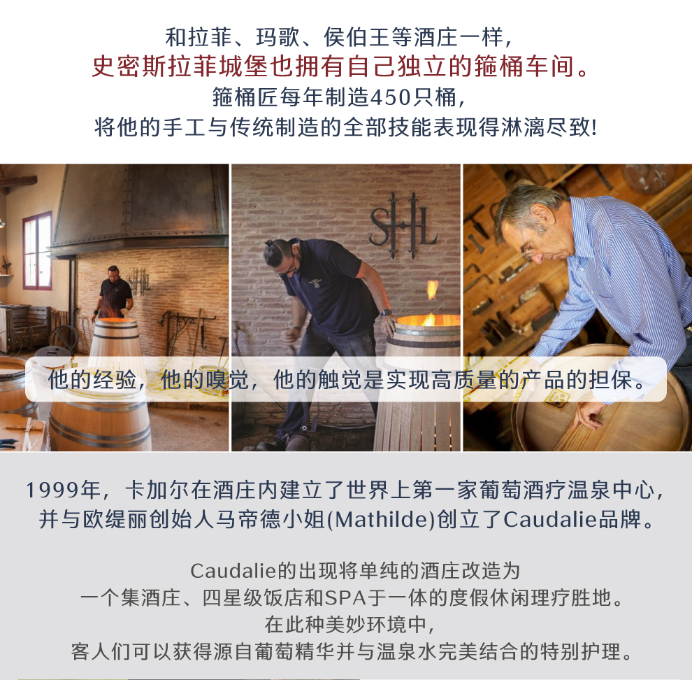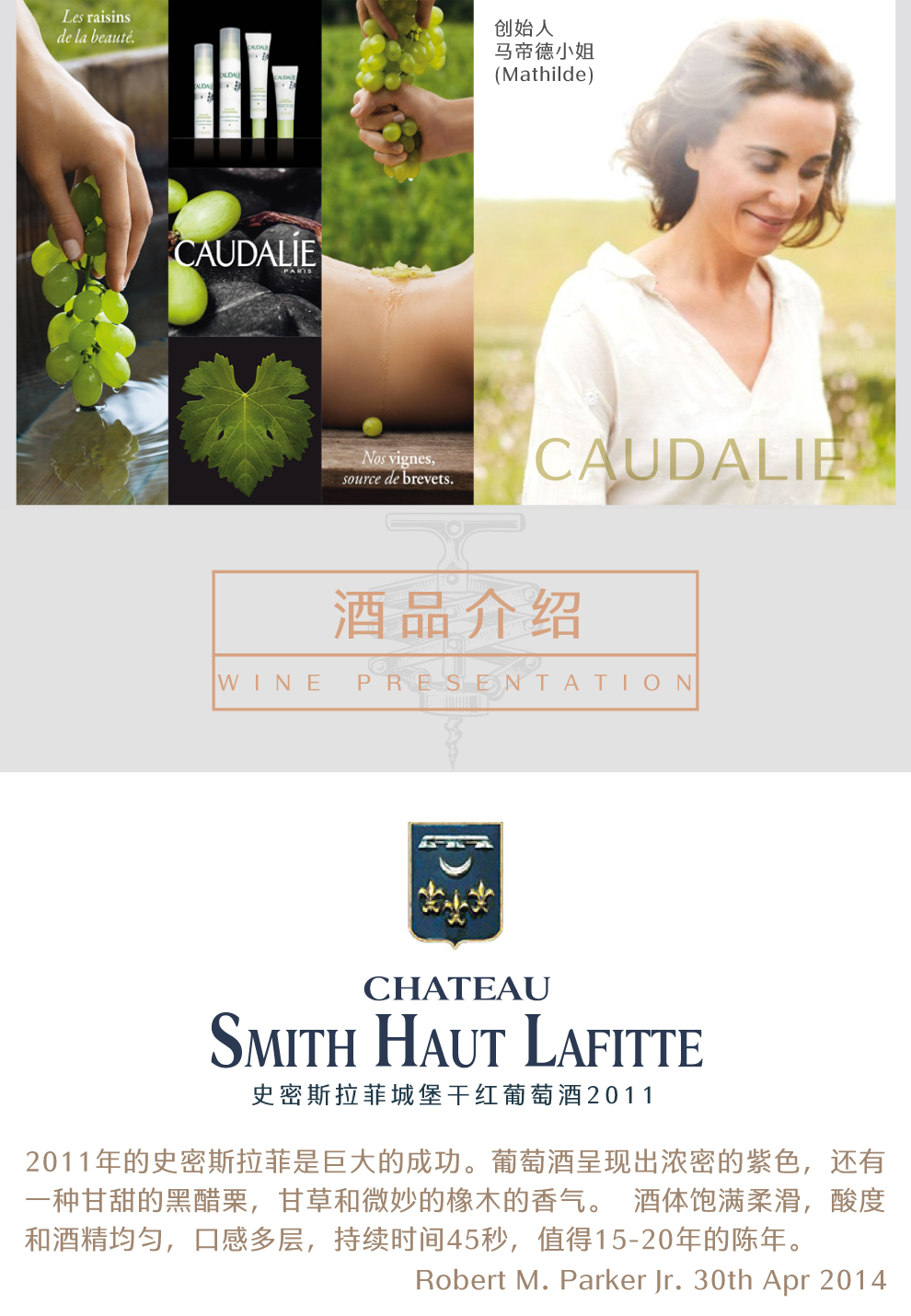 1999年,史密斯拉菲酒庄庄主Florence & Daniel Cathiard在酒庄内建立了世界上第一家葡萄酒疗温泉中心,并与马帝德小姐创立了Caudalie品牌。Caudalie是葡萄酒工艺的专业术语,是用来衡量品尝葡萄酒后余香在口中停留时间。一秒余香等于1caudalie。在此世间少有的美妙环境中,客人们可以获得源自葡萄精华并与温泉水完美结合的特别护理。Caudalie的出现将单纯的酒庄改造为一个集酒庄、四星级饭店和SPA于一体的度假休闲理疗胜地。