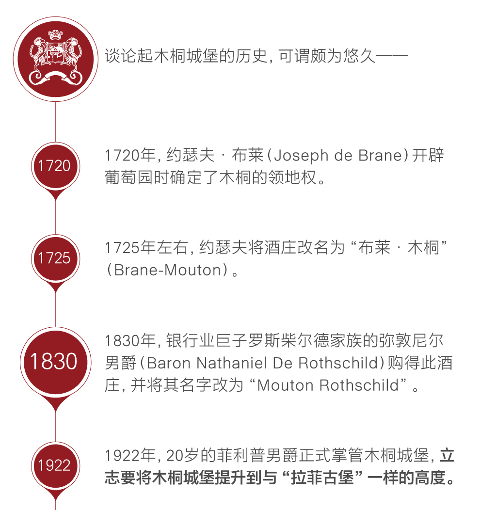1922年10月22日,菲利普男爵正式入主“木桐酒庄”,当时才20岁的男爵立志要将“木桐酒庄”的酒质提升到与邻近“拉图酒庄”和有亲缘关系的“拉菲古堡”一样的水平。在著名的1855年波尔多分级中,“木桐酒庄”只被列为第二级酒庄,因此菲利普男爵下定决心谋求突破。他全情投入,改善酒庄的环境设施以及酿酒技术,建立管理制度,改善葡萄园,1924年首创酒庄瓶装线的制度,1926年增建100米长的橡木桶陈酿窖,将木桐酒庄从他入主时的一个农村酒庄变为世界先进的顶级酒庄。由于木桐酒庄出产的酒保持着高质量,所以酒的价格一直在最高之列,有时还超过四大顶级酒庄。菲利普提出要将木桐酒庄升级,并为此努力了20年。1973年,木桐酒庄正式升级为一级酒庄。从此,木桐酒庄成为法国波尔多五大顶级酒庄之一。