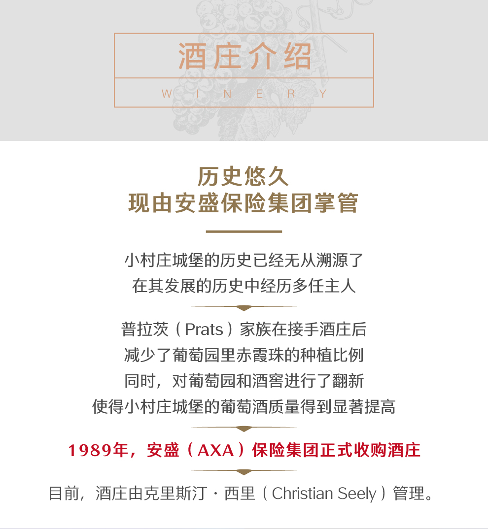 小村庄酒庄目前已经无从溯源了。在现有的资料里,德·萨格英(De Seguin)家族是酒庄第一位有记载的庄主。后来,酒庄多次易主。酒庄先被布丁-巴菲(Buidin-Buffin)先生购得,后又转手给了海伦(Heron)先生。