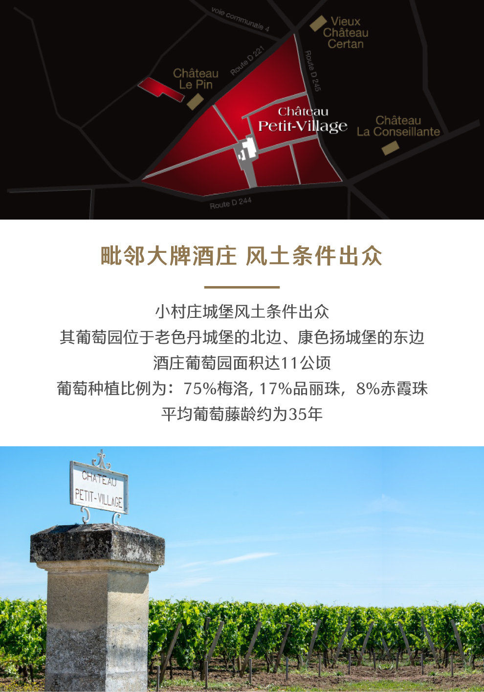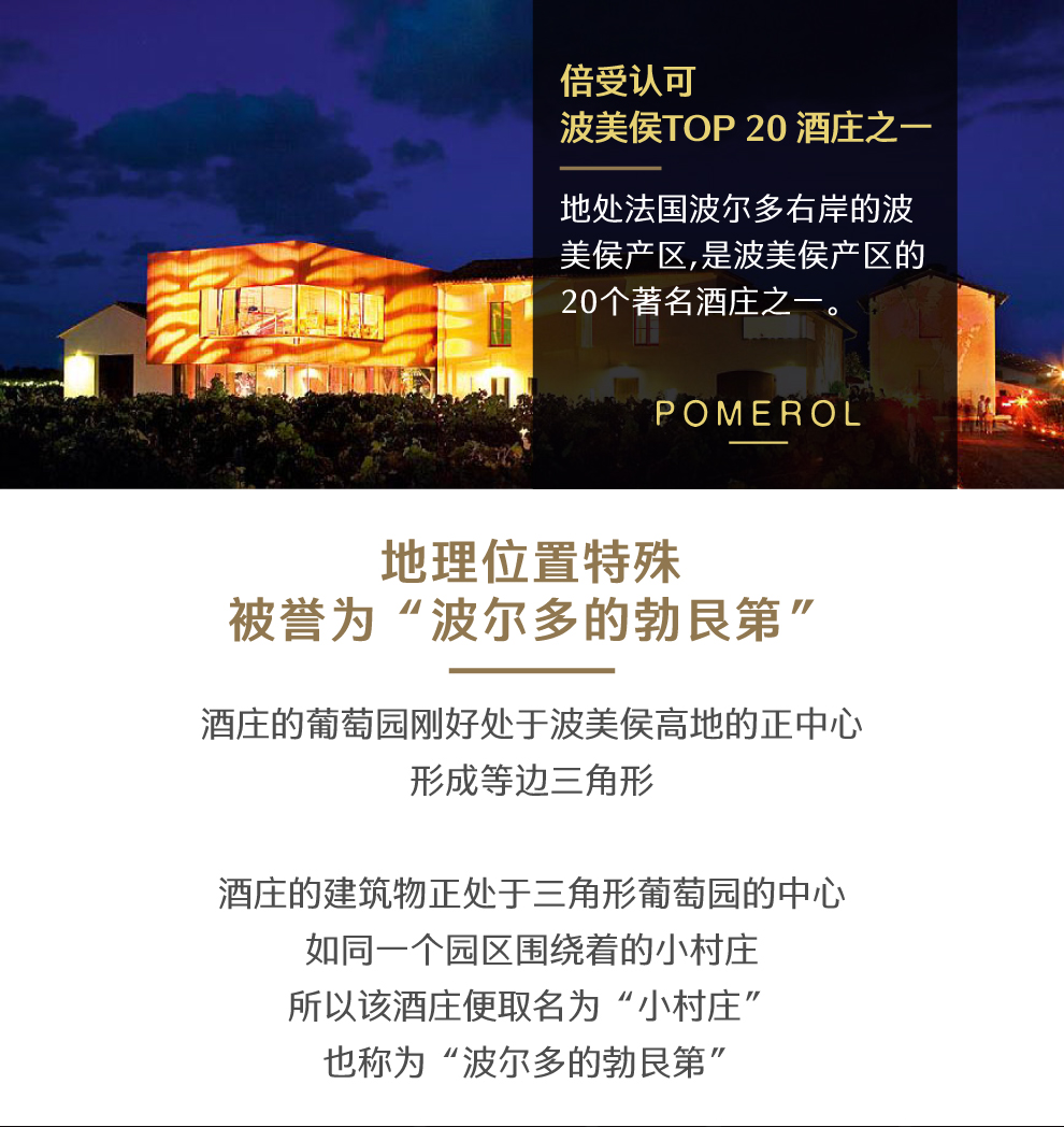 小村庄酒庄(Chateau Petit-Village)地处法国波尔多右岸的波美侯产区,是波美侯产区的20大顶级酒庄之一。酒庄的葡萄园刚好处于波美侯的高地正中心,形成等边三角形,酒庄的建筑物正处于三角形葡萄园的中心,像是被园区围绕着的一个小村庄,于是,该酒庄便取名为”小村庄酒庄”,又被称为“波尔多的勃艮第”。