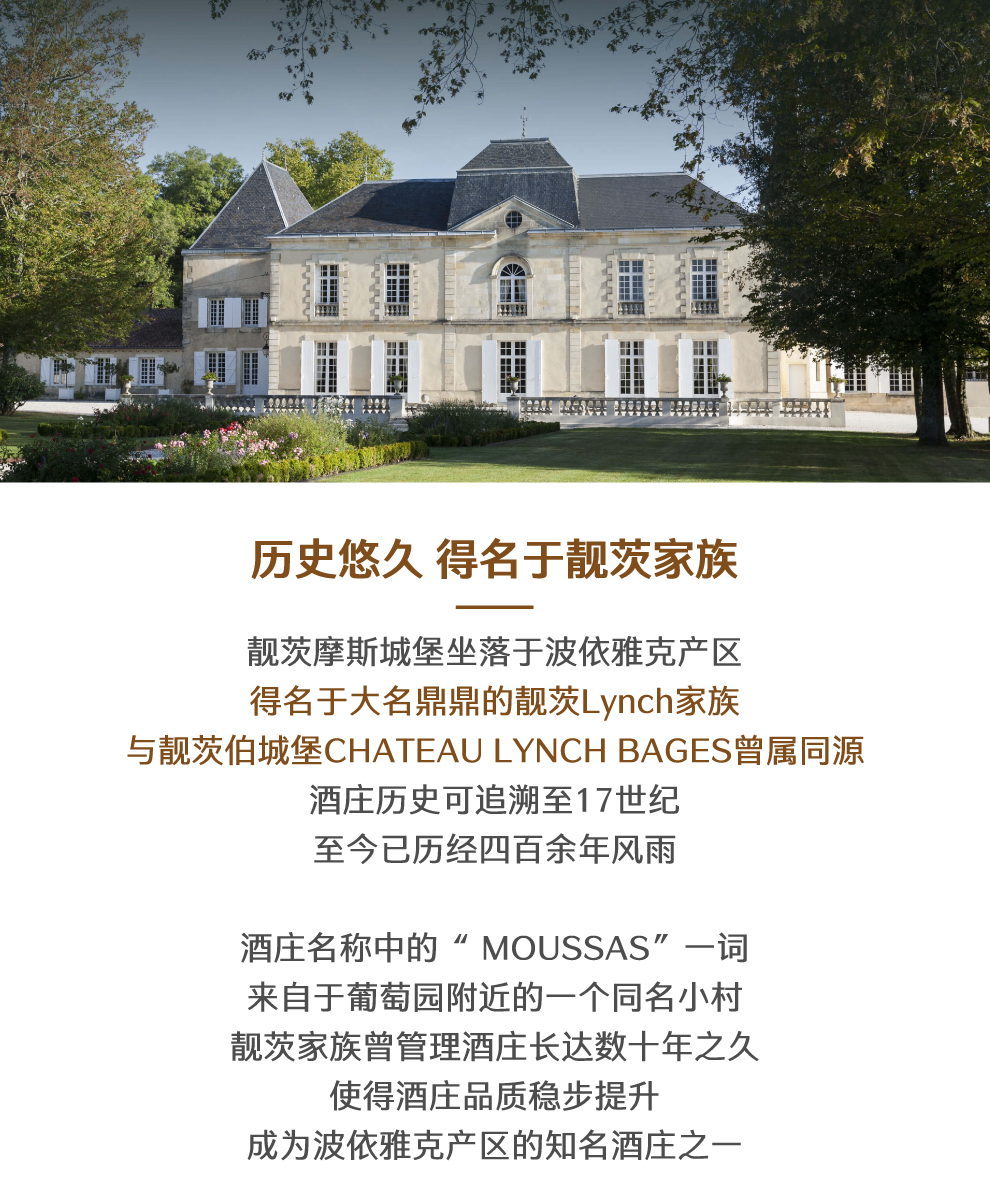 靓茨摩斯庄园(Chateau Lynch-Moussas),历史可以追溯到靓茨家族Lynch时期,一位叫做约翰-靓茨John Lynch的爱尔兰军人。他1691年离开爱尔兰,自世纪末开始便在法国定居并在此成家立业。18世纪期间,靓茨家族大量购买土地,不但拥有了波亚克的靓茨伯庄园Lynch-Bages(五级庄,通过联姻而归其名下)以及靓茨摩酒庄,而且还买下了位于玛歌区的杜扎克庄园(Dauzac)。