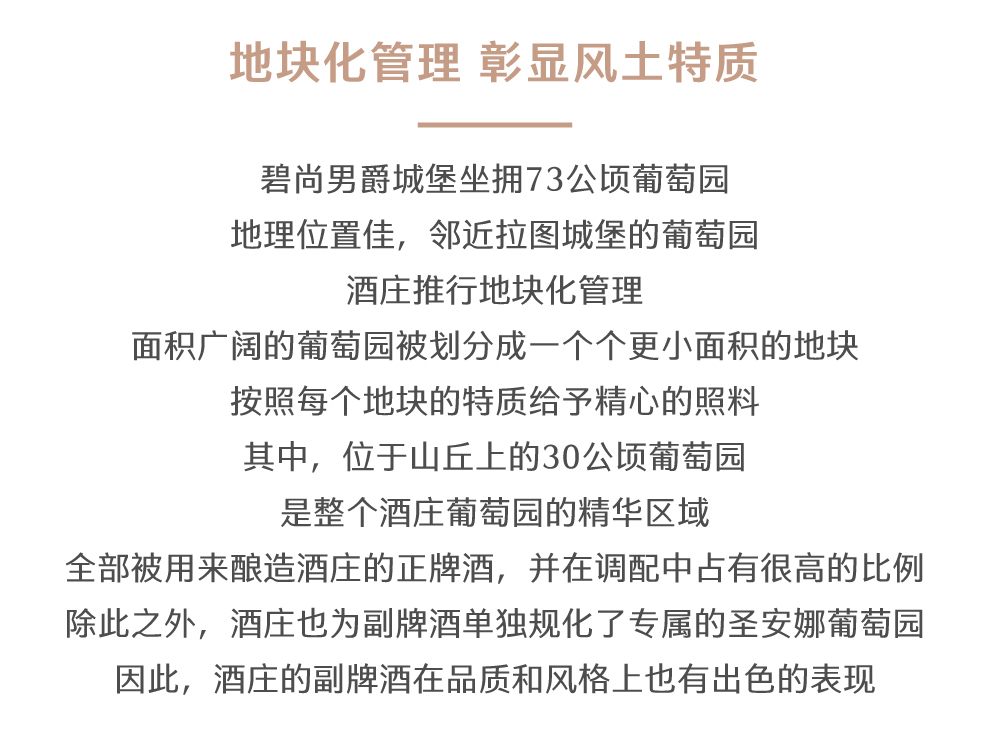 酒庄的管理团队对葡萄园的打理十分细致,他们认真而严谨地对待每一个步骤,以确保酿酒葡萄的品质。酒庄葡萄园的种植密度为9,000株/公顷,每一葡萄地块的产量根据葡萄藤的树龄及葡萄品种进行控制。在管理葡萄园时,酒庄尊重自然。为了保证葡萄的最佳状态,酒庄采用人工的方式采摘葡萄,经过层层筛选,成熟度最佳的葡萄才能用于酿造葡萄酒。