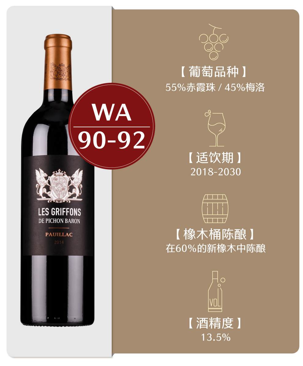 男爵古堡的正牌酒风格优雅而富有力量,能够展现出波雅克的浓郁与复杂,风味十分丰富,单宁成熟且强劲,具有较强的陈年潜力。此外,酒庄还生产两款副牌酒,分别为男爵古堡副牌红葡萄酒(Les Tourelles de Longueville)及男爵古堡狮鹫红葡萄酒(Les Griffons de Pichon Baron)。这两款副牌酒风格活泼,同样也具有迷人的特质,它们一般更适宜早饮。