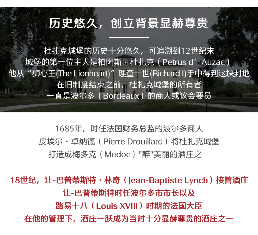 1622年,波尔多议会的检察官让·库索(Jean Cousseau)买下了这个葡萄酒产地。1685年,一位富有的批发商皮埃尔·德鲁亚将杜扎克酒庄建成了梅多克地区最华丽壮观的葡萄酒城堡之一,并且在他去世时,留下了这样的一个产区,它的“葡萄酒极其出色,价格相当合理”……