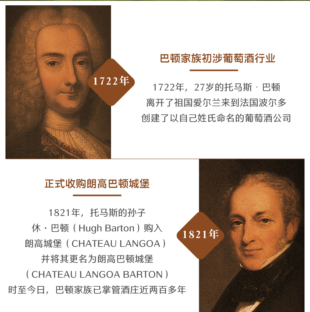 1722年,27岁的托马斯•巴顿离开了祖国爱尔兰来到法国波尔多,创建了以自己姓氏命名的葡萄酒公司。1821年,托马斯的孙子休·巴顿(Hugh Barton)购入朗高城堡(CHATEAU LANGOA)并将其更名为朗高巴顿城堡(CHATEAU LANGOA BARTON)。至今日,巴顿家族已掌管酒庄近两百多年。