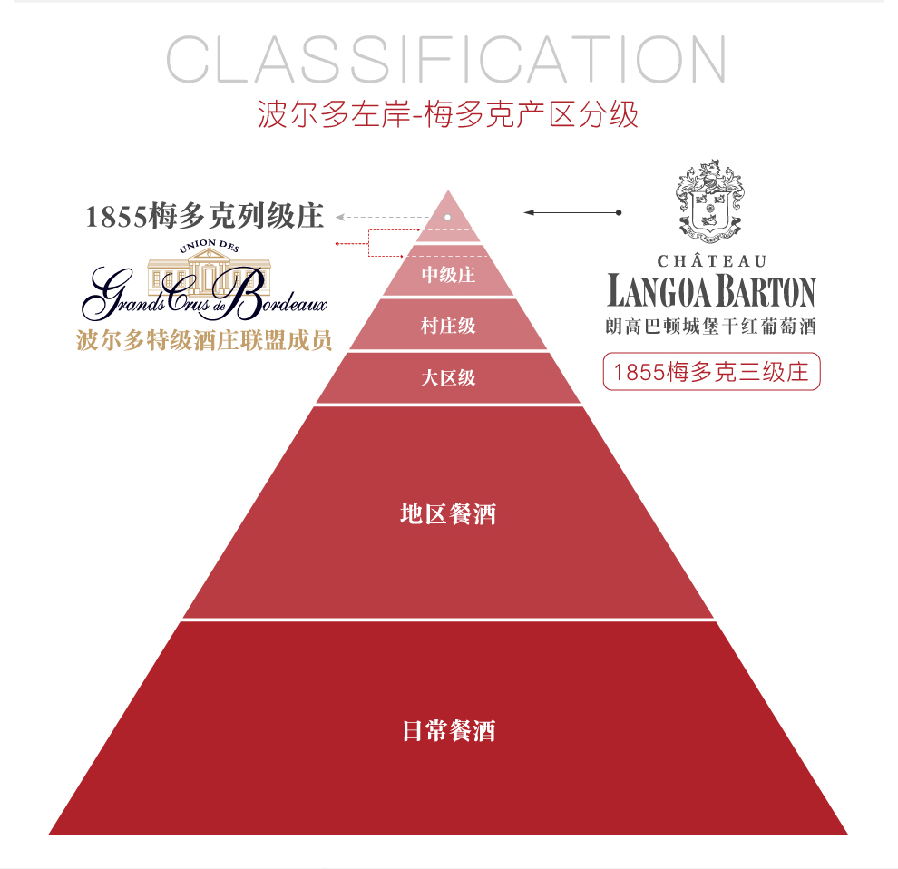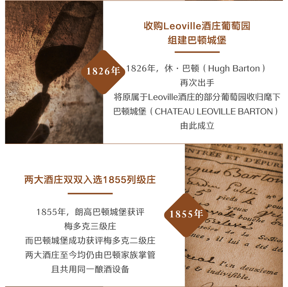 1826年,休·巴顿(Hugh Barton)再次出手,原属于Leoville酒庄的部分葡萄园收归麾下,巴顿城堡(CHATEAU LEOVILLE BARTON)由此成。1855年,朗高巴顿城堡获评梅多克三级庄,而巴顿城堡成功获评梅多克二级庄,两大酒庄至今均仍由巴顿家族掌管且共用同一酿酒设备。