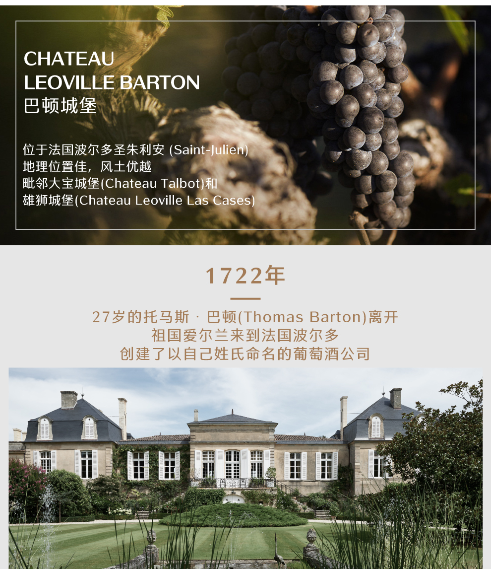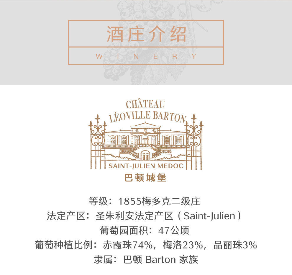(Chateau Leoville Barton)位于法国波尔多圣朱利安 (Saint-Julien)产区的中心地带,在1855分级中被评为二级庄,与大宝酒庄(Chateau Talbot)和雄狮酒庄(Chateau Leoville Las Cases)相邻。