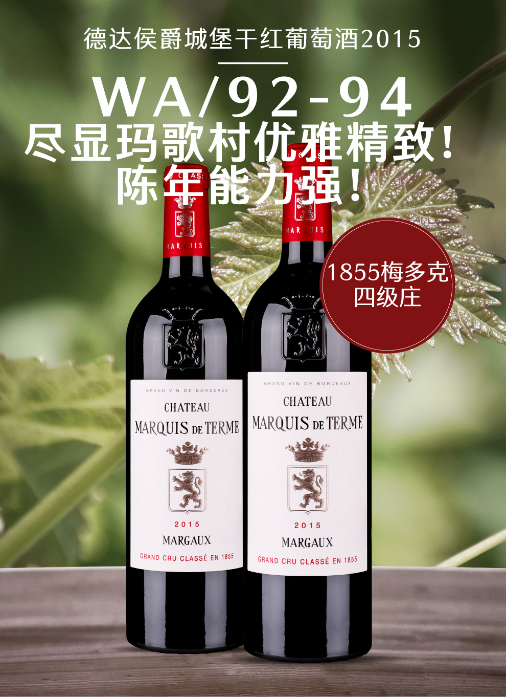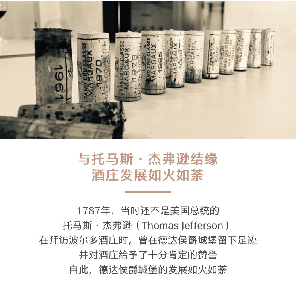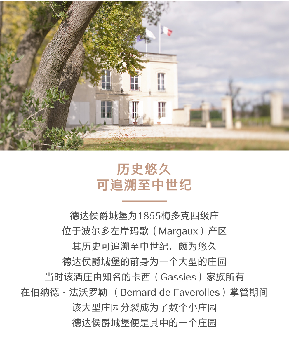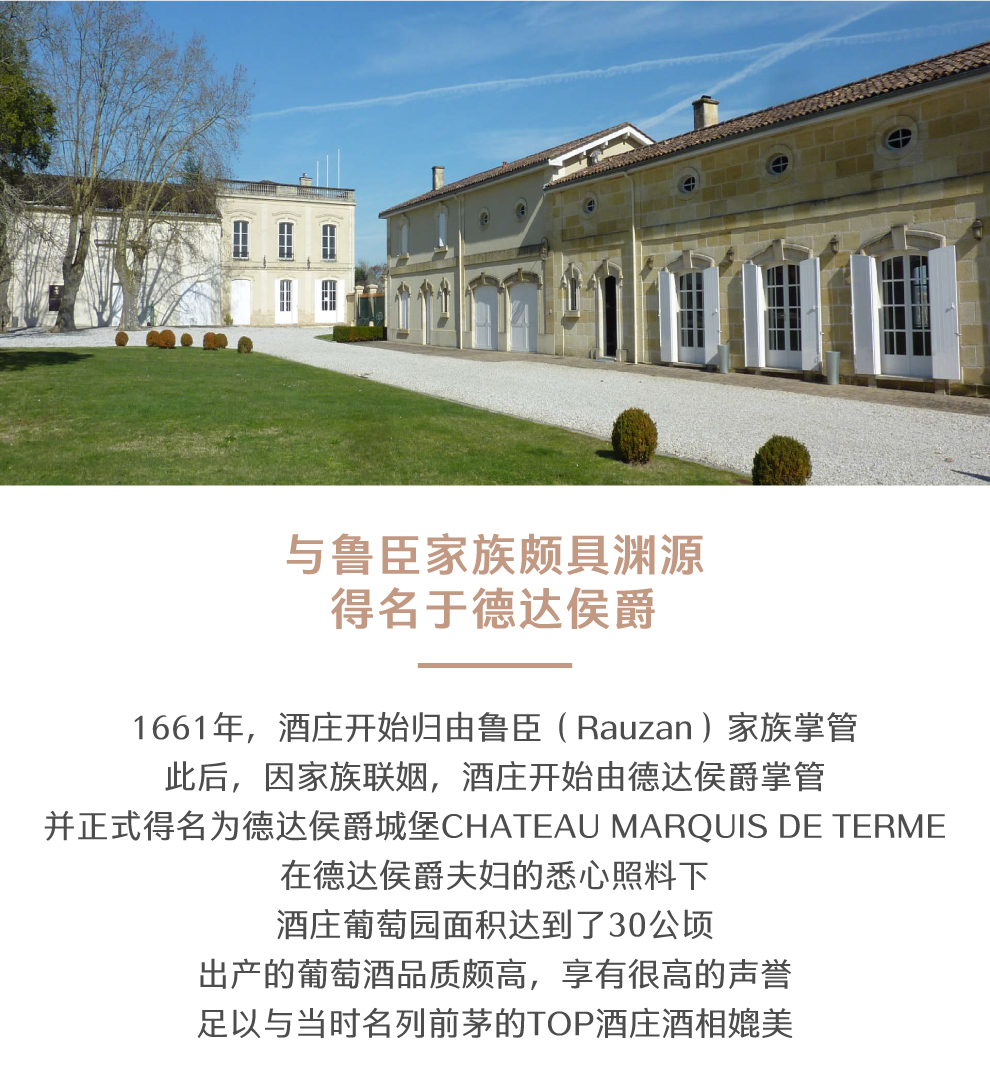 德达侯爵庄园(Chateau Marquis-de-Terme)位于波尔多左岸玛歌(Margaux)产区,其历史最早可追溯至中世纪。当时该酒庄的前身为拥有一个大型庄园的卡西(Gassies)家族所有。后来卡西家族所拥有的大型庄园由伯纳德•法沃罗勒 (Bernard de Faverolles)接管,在他接管期间,这个大型庄园分成了数个小庄园,德达侯爵庄园便是其中一个。1661年,德达侯爵庄园开始归鲁臣 (Rauzan)家族所管。此后的家族联姻,该酒庄作为嫁妆传到了德达侯爵手中,便正式得名为德达侯爵庄园。在德达侯爵夫妇的悉心照料下,当时30公顷的酒庄出产的葡萄酒享有很高的声誉,价格也不低,足以与当时的顶级酒庄酒相媲美。1787年,当时还不是美国总统的托马斯•杰弗逊(Thomas Jefferson)在拜访波尔多酒庄时曾在此酒庄留下足迹,并对此酒庄给予了极高的赞誉。自此,德达侯爵庄园发展得如火如荼。