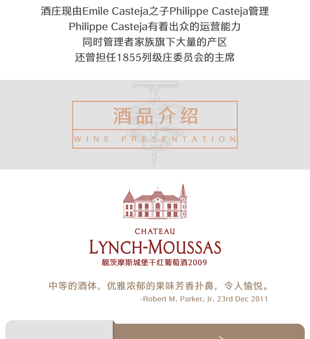 靓茨摩斯庄园(Chateau Lynch-Moussas)城堡是一座十八世纪风格的建筑,现在成为了埃米尔的儿子菲利普-卡斯特加(Philippe Casteja)的居所,他不仅管理着靓茨摩斯庄园,还管理着大量的家族产业。他不仅是宝里-曼诺克斯Borie-Manoux酒商公司的领导,同时还曾是“1855列级名庄委员会Conseils de Grands Crus Classes en 1855”的主席。
