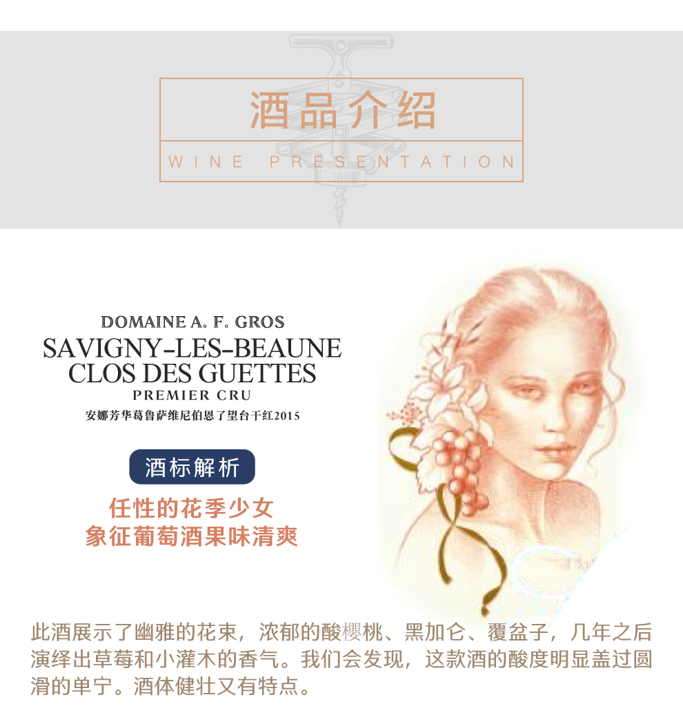 目前,安娜-弗朗索瓦丝·葛鲁酒庄对外发布的十几个酒款主要以特级园葡萄酒和一级园葡萄酒为主,这些葡萄酒销往全球30多个国家和地区,受到各国消费者的青睐。