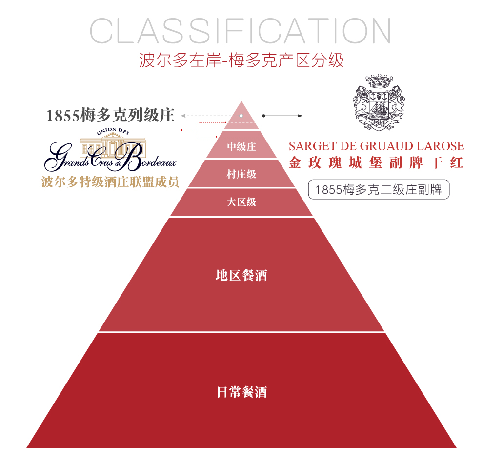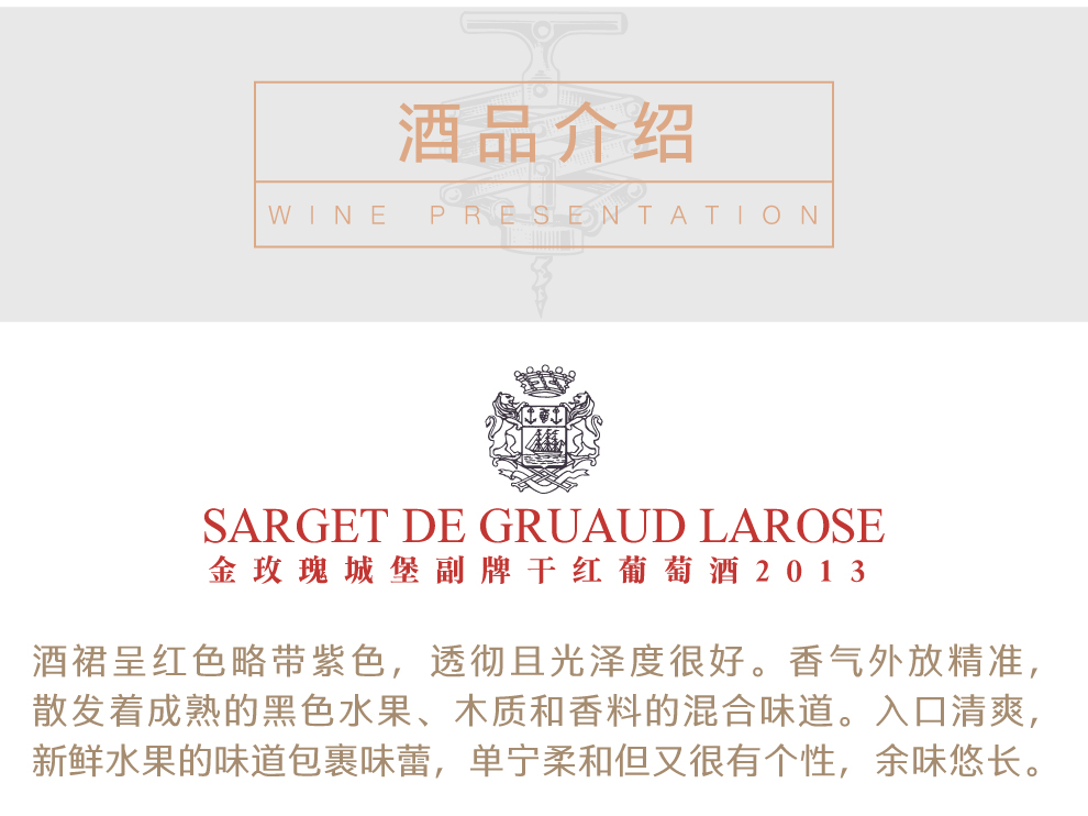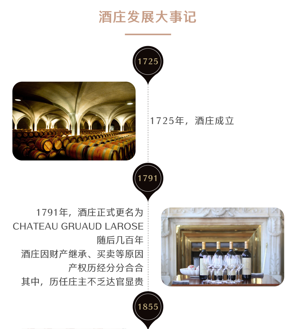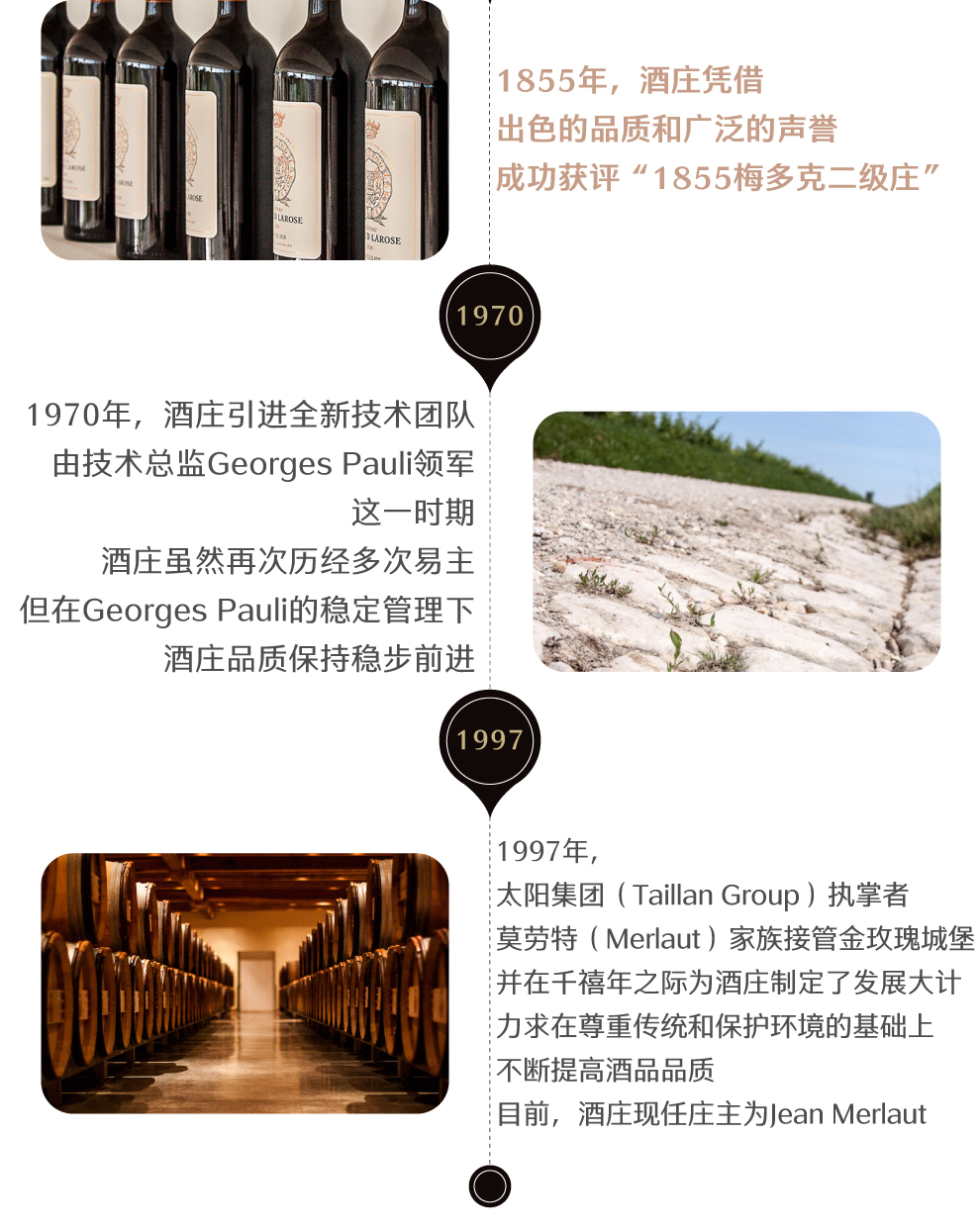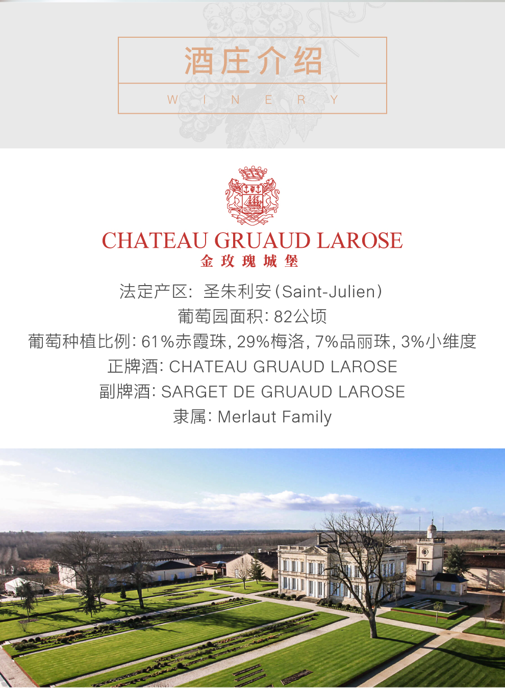 1855年梅多克分级二级庄Chateau Gruaud Larose位于波尔多左岸Saint Julien, 城堡于1725年建立, 而1791年时才正式有了Gruaud Larose这个名字, 几百年来因财产继承以及买卖等过程, 城堡所有权分分合合, 1917年Cordier家族先买下当时一分为二的Chateau Gruaud Larose其中一半的所有权-Gruaud Larose Sarget, 并于1935买下另一半Gruaud Larose Bethmann, 直到此时Chateau Gruaud Larose终于结束百多年来的分裂, 在Cordier家族的致力经营之下, 也出现了极为精采的1961年份, 以及1962, 1966, 1970年等佳酿。1970年开始酒庄引进新的技术团队, 由技术总监Georges Pauli领军, 1983年苏伊士Suez集团入主, 1993年又转手到艾卡特·艾斯森Alcatel Alsthom集团旗下, 引进计算机管理以及许多新科技, 并扩大厂房及更新酒窖设备, 使Chateau Gruaud Larose更为现代化, 1997年Merlaut家族入主, 现今庄主为Jean Merlaut, 1970年代开始虽然酒庄数度易主, 但仍由Georges Pauli执掌的技术团队负责酿酒。