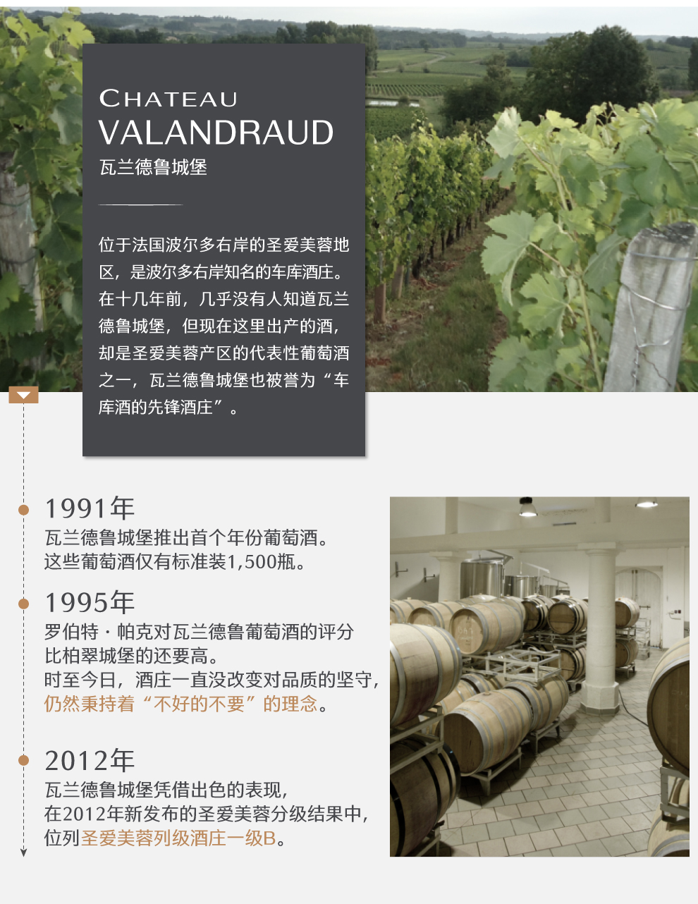 瓦兰德鲁城堡(Chateau Valandraud)位于法国波尔多右岸的圣爱美容地区,是波尔多右岸知名的车库酒庄。在十几年前几乎没有人知道瓦兰德鲁城堡,但现在这里出产的酒却是圣爱美容地区价格最高的酒。