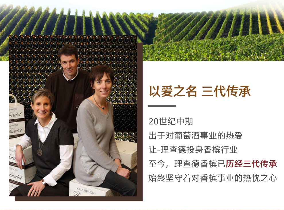 20世纪中期,出于对葡萄酒事业的热爱,祖父让-理查德给自己下了一个赌注,将几块田改造成了葡萄园,专门用于酿造香槟。这份热爱逐渐转化为一份职业,他的生活围绕着季节、采摘、酿酒开展。在年老时,让把他最为迷恋的香槟事业交给了后人。