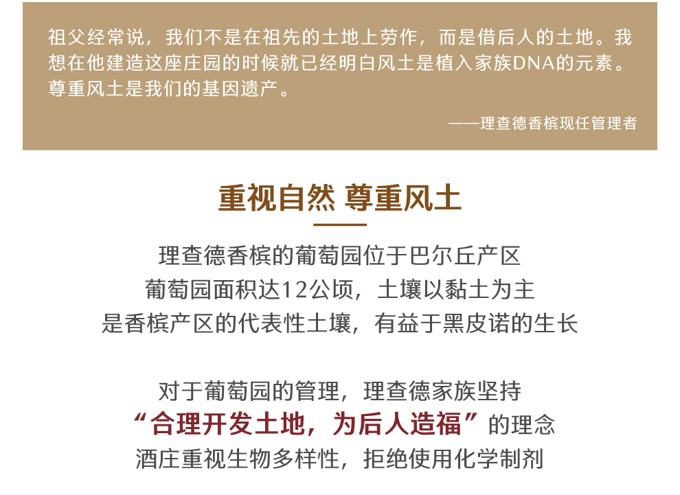 理查德葡萄园位于塞纳河与奥布河之间的巴尔丘产区,葡萄园面积12公顷,位于海拔300米左右的山坡上,朝向南/ 东南。土壤以黏土为主,是香槟产区最具代表性的土壤,可以充分发挥黑皮诺的优势,保障其特有的精致香气。